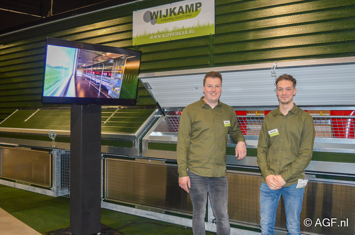 Rico Wijgergangs en Maxim van Harskamp van Wijkamp Farming Solutions met achter zich de kippenkar, die overal mobiel inzetbaar is.