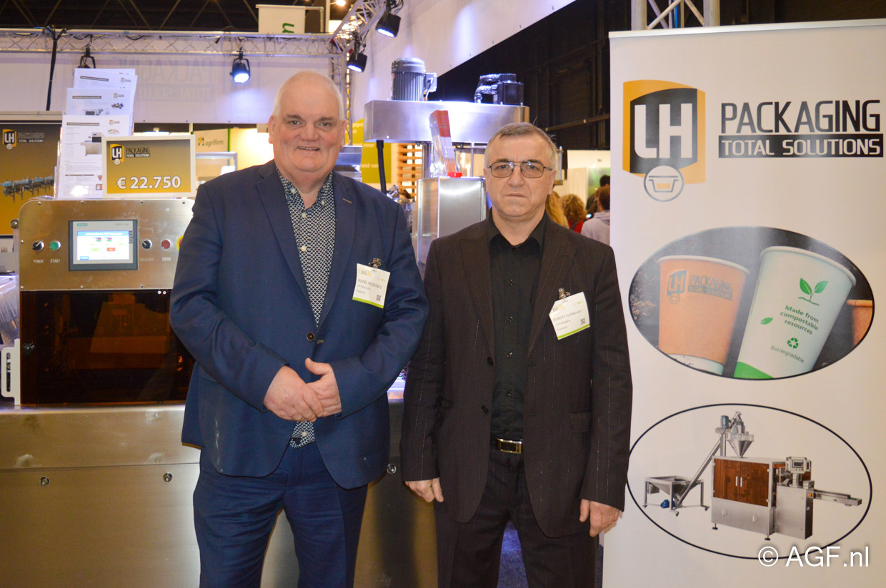 Rene Hendriks en Robert Elembajev van LH Packaging. Zij hadden een breed assortiment verpakkingsmachines meegenomen die zijn toegesneden op de voedingsindustrie.