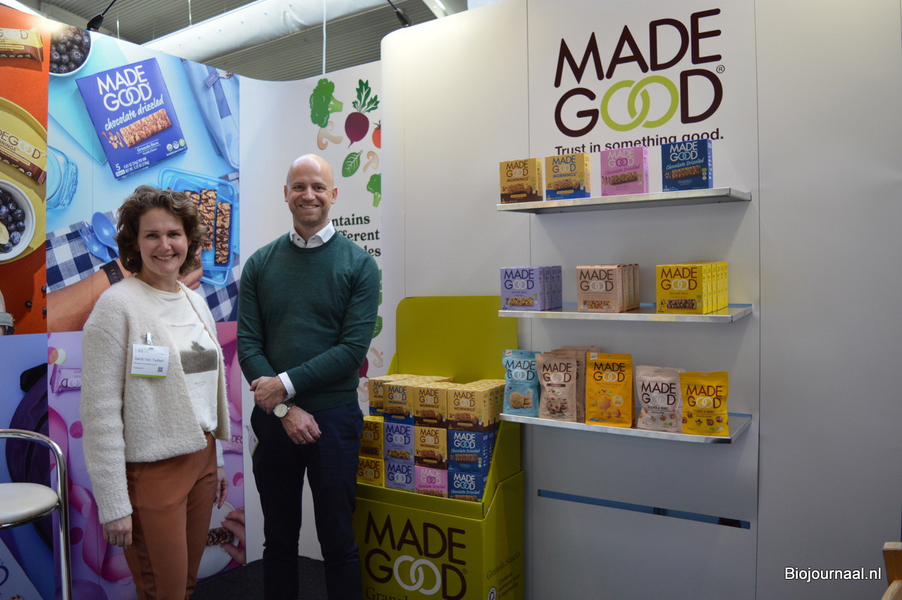 Gerdi van Twillert en Tim Laarman introduceerden bij Riverside International de nieuwste producten van MadeGood: de MadeGood Mornings. Deze zacht gebakken haverrepen zijn er in twee varianten - Chocolate Chip en Blueberry Flavour. "Ze worden heel goed ontvangen", aldus Tim.