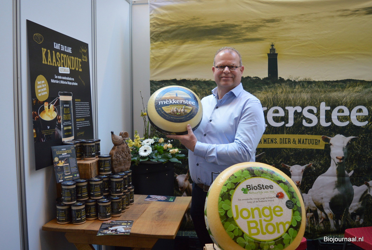 Piet den Hertog met de geitengatenkaas van De Mèkkerstee, Bioproduct van het jaar 2022. Links op de foto de nieuwe kant-en-klare kaasfondue.