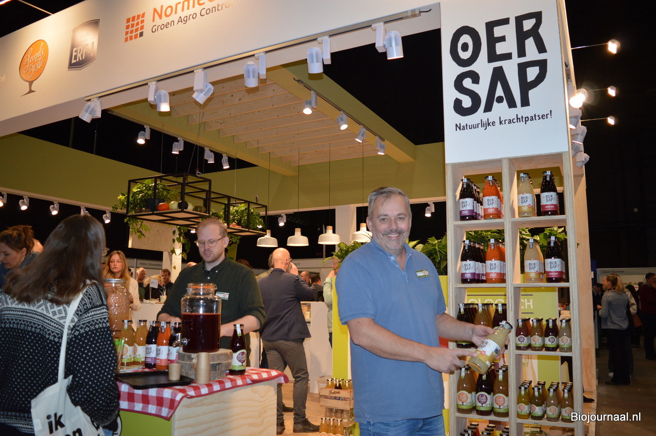 Bij Flevosap kon men proeven van de OERsappen. Cees-Jan de Bruijn toont de laatste toevoeging: OERsap Elstar Appel, gemaakt met de biodynamische appels van overbuurman Rein Mantel.