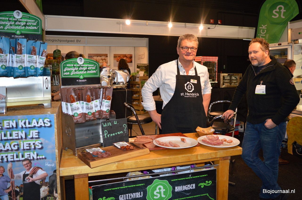 Henk van Oers met de droge worsten van St.Hendrick. "We gaan samenwerken met Klaas de Lange van Weerribben Zuivel. We gaan er voor zorgen dat binnenkort alle rundvleesproducten van St.Hendrick afkomstig zijn van de koeien van Klaas."