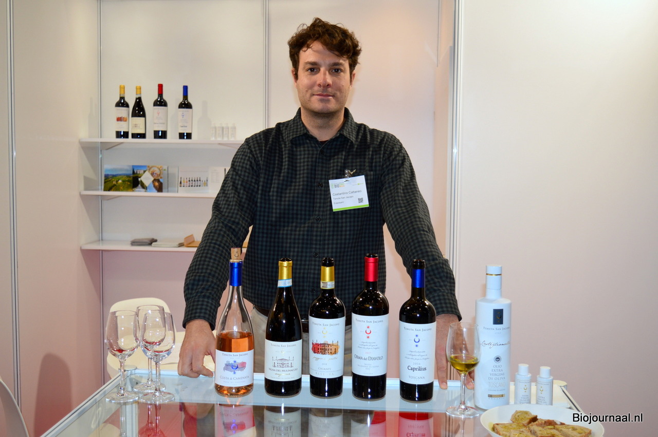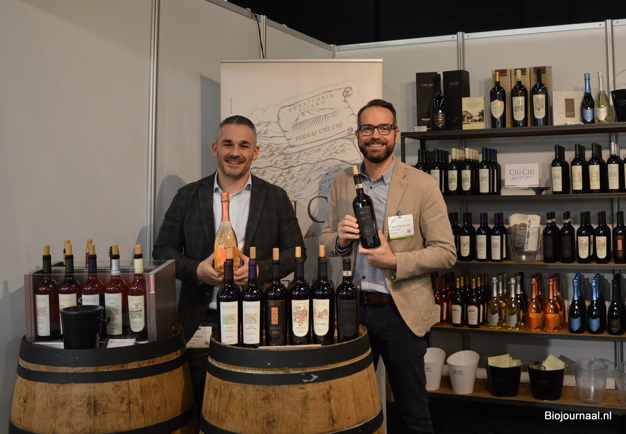 Carlo Moro van Mercato Italiano (links) toont een biologisch wijn van het vegan gecertificeerde wijnhuis Ciu Ciu uit Le Marche, in de heuvels van Piceno.