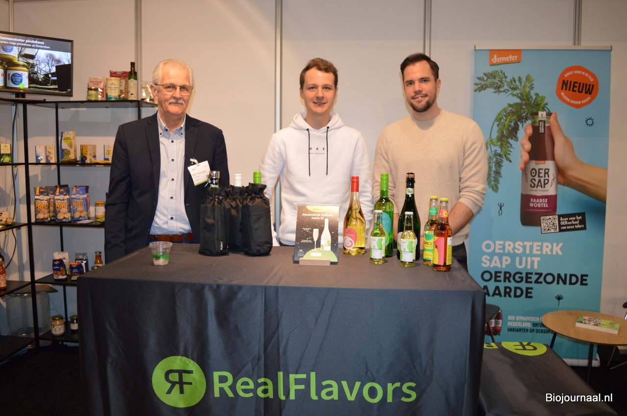 Bij RealFlavors: Bert Versteeg, Jordy Versteeg en Dennis Brunnemann. Op de tafel voor hen staat de recent toegevoegde range biologische alcoholvrije wijnen.