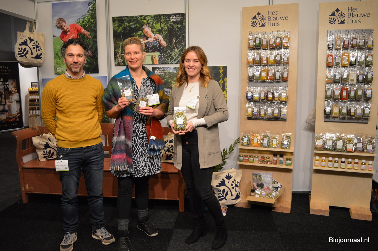 Rhea Schokker, Jetse Schokker en Sandy Vree hadden veel nieuws bij IDorganics. In Jetse's handen de nieuwe potten van Wisselwaar en een pak Kaap Koffie. En er is meer: "Onze kartonnen silo's zijn nu ook voor de Nederlandse markt beschikbaar", aldus Jetse.