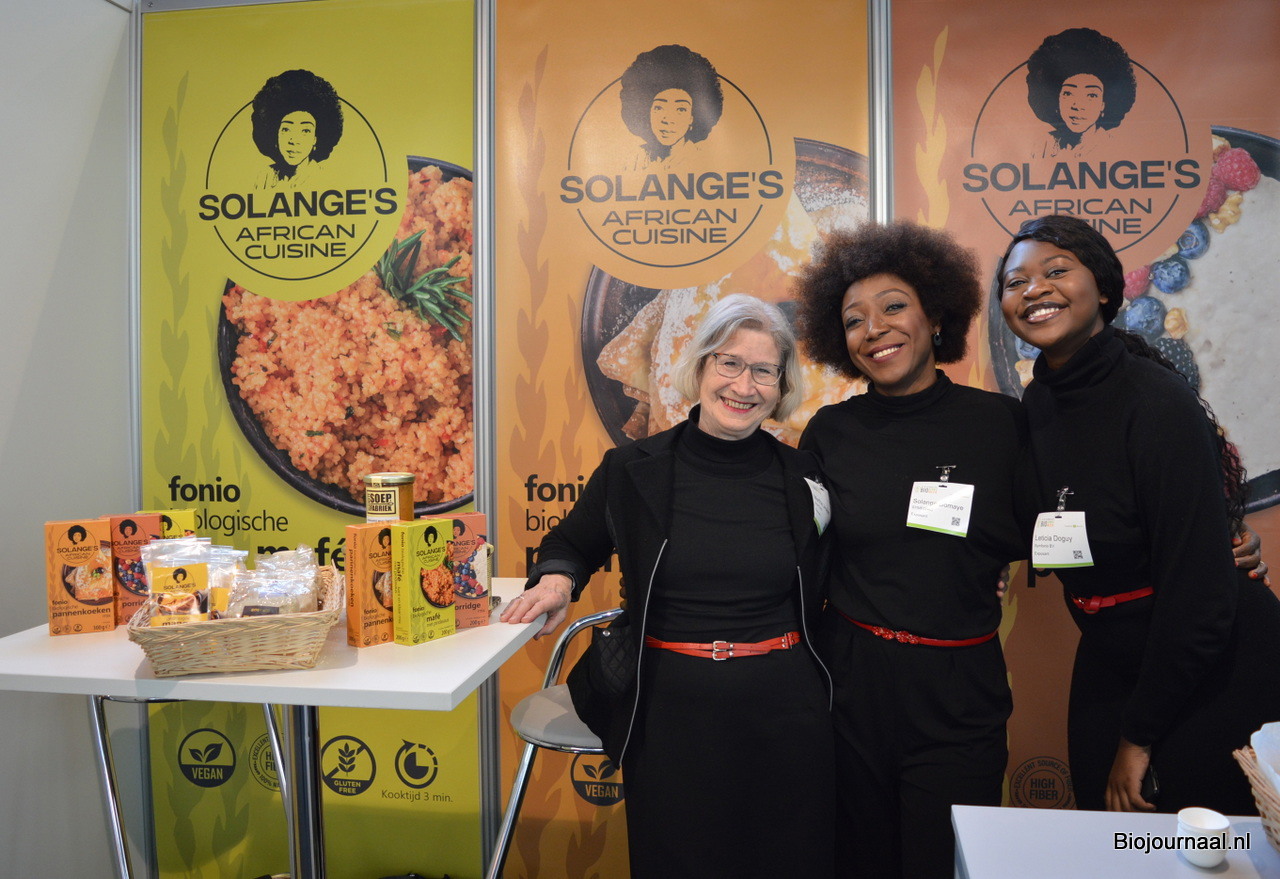 Martha Jeuken, Solange Domaye en Leticia Doguy bij Symfonio. Symfonio lanceerde op de Biobeurs haar eigen merk Solange's African Cuisine - bestaande uit een zestal producten op basis van het biologische Afrikaanse oergraan fonio. "We krijgen heel mooie reacties!", aldus Solange.