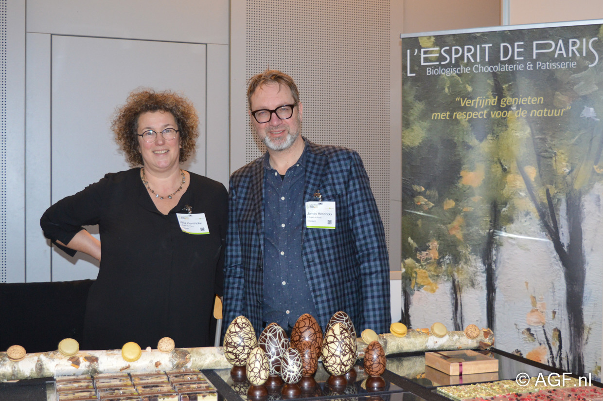 Wija en James Hendrickx van L'esprit De Paris met voor zich de speciale chocoladeproducten en cadeauartikelen die zij vervaardigen.