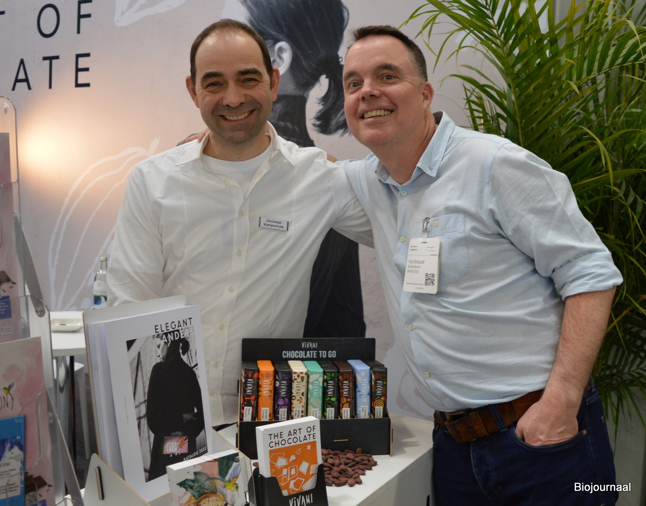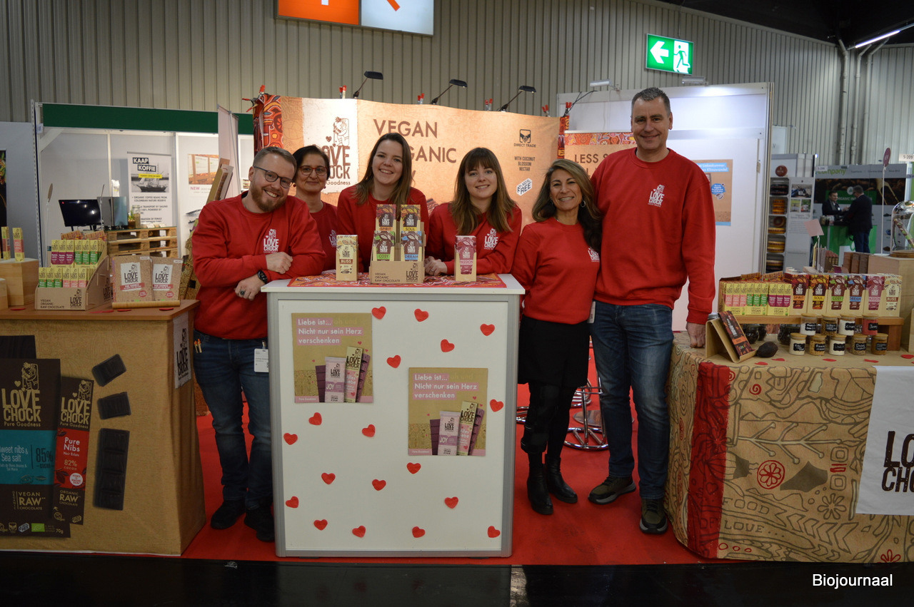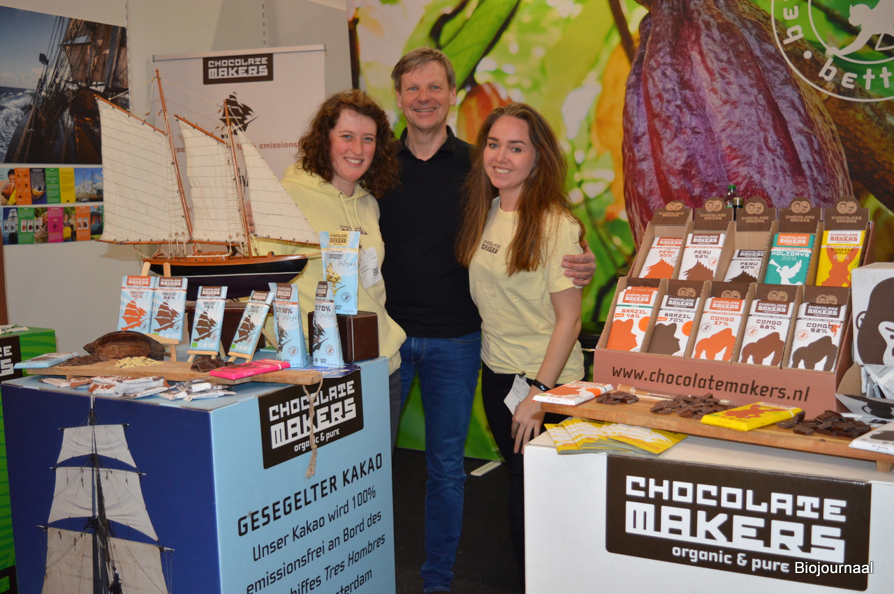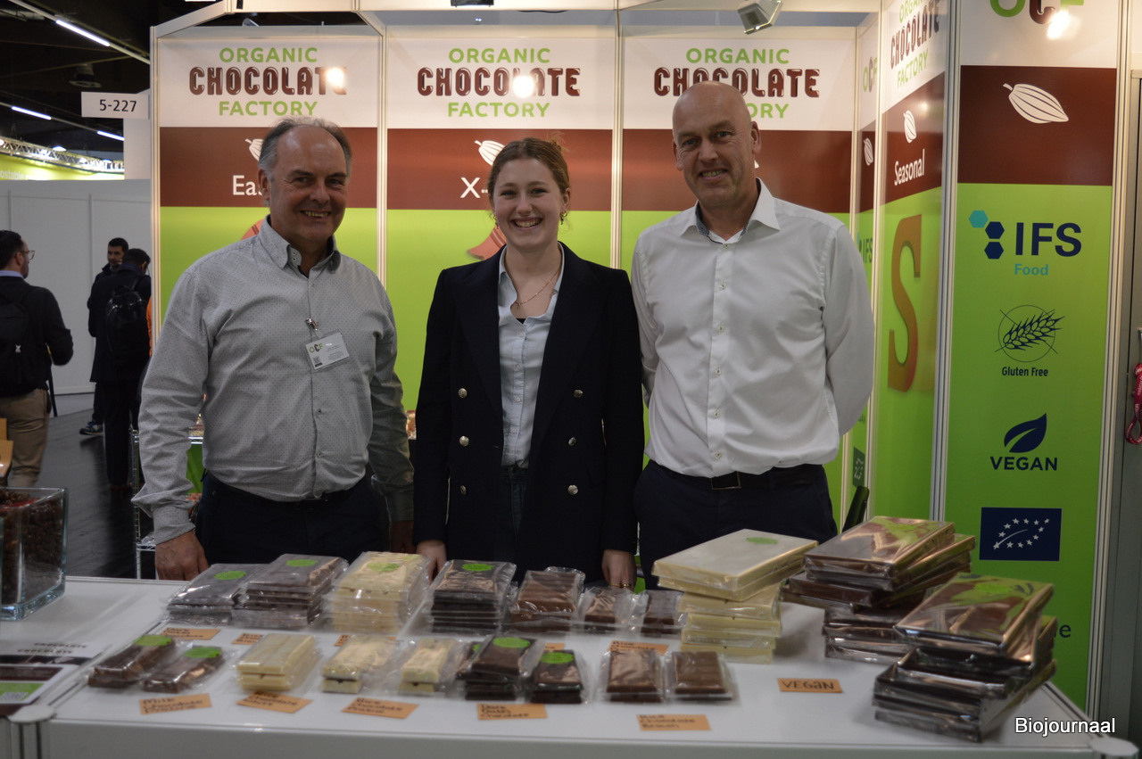 Bonvita stond voor het eerst als productiebedrijf en niet alleen als merk op de Biofach. Erik van Luyn (links op de foto): "Door hier als Organic Chocolate Factory te staan leggen we meer de nadruk op de productiekant en is het veel duidelijker wat we kunnen doen op het gebied van private label." Naast Erik staan Vere en Bart Spoorenberg.