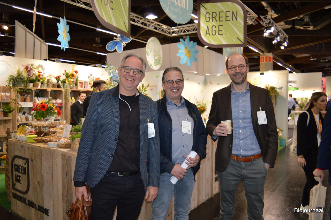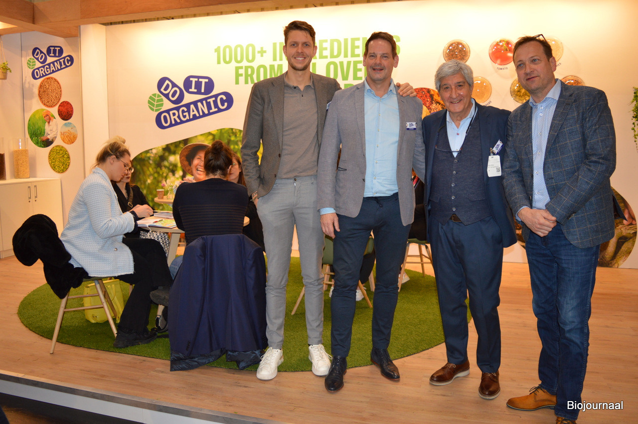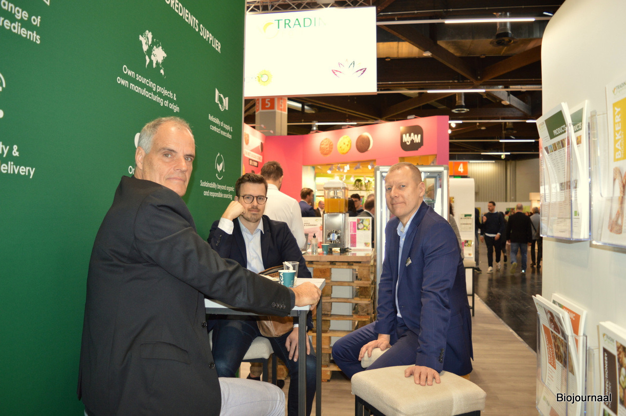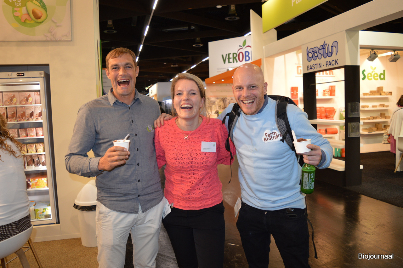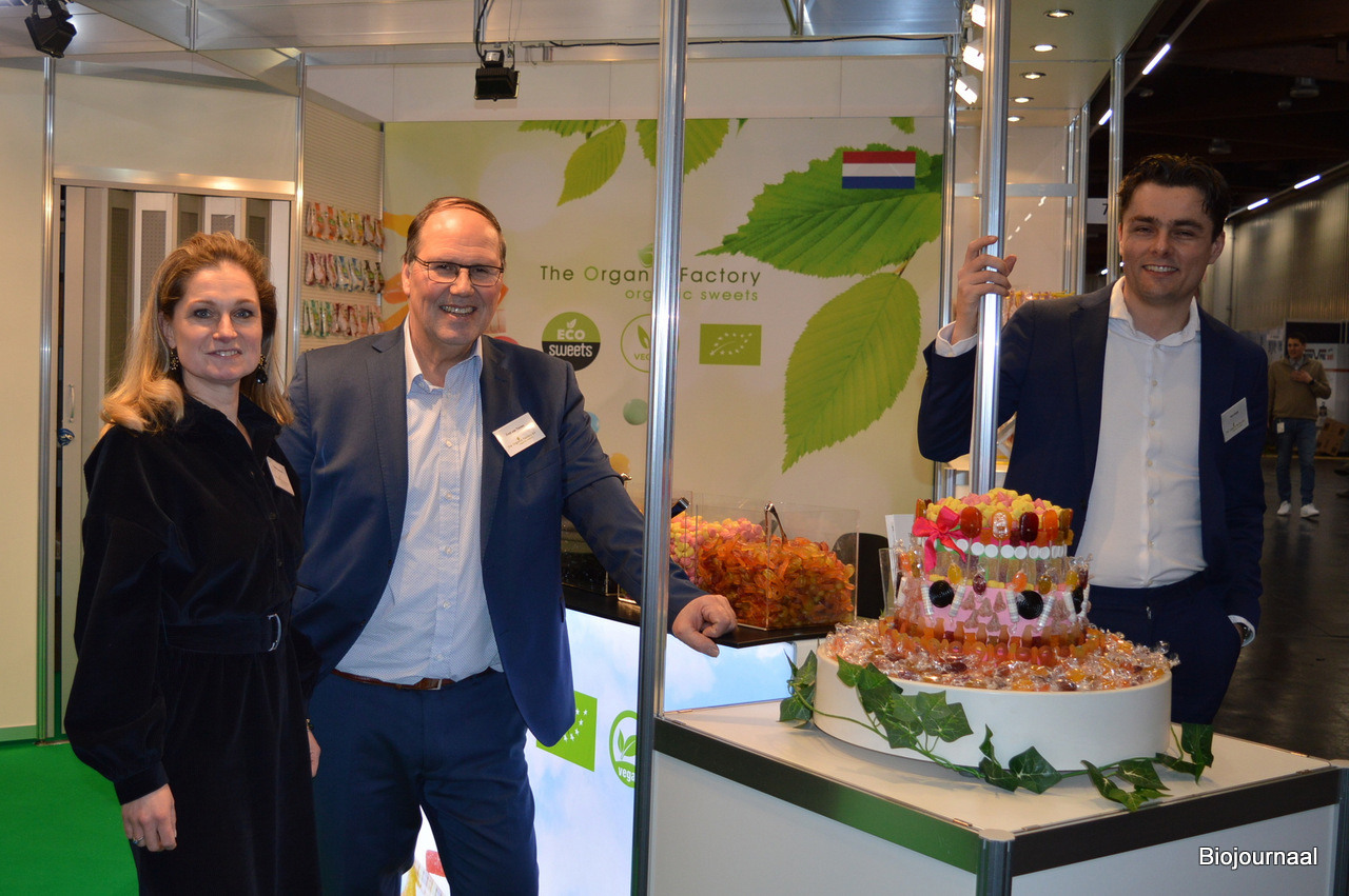 Bonvita stond voor het eerst als productiebedrijf en niet alleen als merk op de Biofach. Erik van Luyn (links op de foto): "Door hier als Organic Chocolate Factory te staan leggen we meer de nadruk op de productiekant en is het veel duidelijker wat we kunnen doen op het gebied van private label." Naast Erik staan Vere en Bart Spoorenberg.