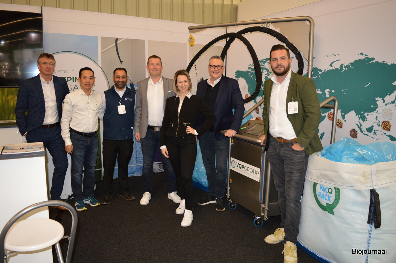 Bij VacQPack hebben ze een andere machine ontwikkeld die het proces 5 keer versnelt. "Het kost onze klanten nu maar 3 tot 4 minuten per big bag", vertelt Mark Klopstra. Van links naar rechts: Eric van Gelderen, Kelvin Nam, Jay Shah, Mark Klopstra, Marta Mottin, Joren Nieuwenhuizen en Dennis van der Leeden.