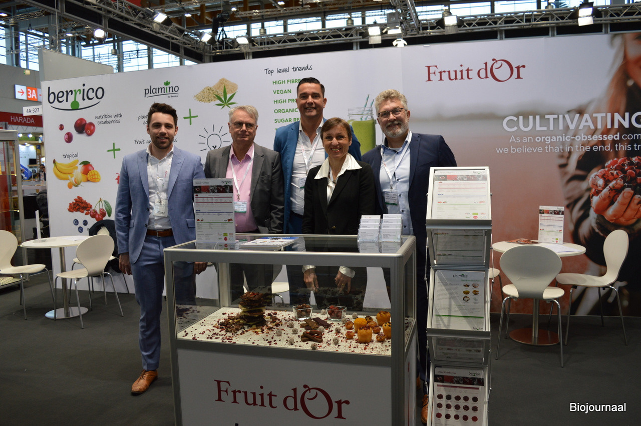 Bij Berrico FoodCompany & Berryceuticals: Tasso Skerletidis, Renno van Dijk, Roy Oostweegel, Guillemette Bazzini en Carlo van Seeters. Nieuw bij Berrico zijn onder meer: dadelpoeder, dadelballetjes en dadelsnacks - evenals kokosvlokken, die gebruikt kunnen worden als knapperig glutenvrij ontbijtgraan. Berrico stond voor de 20ste keer op de BIOFACH.