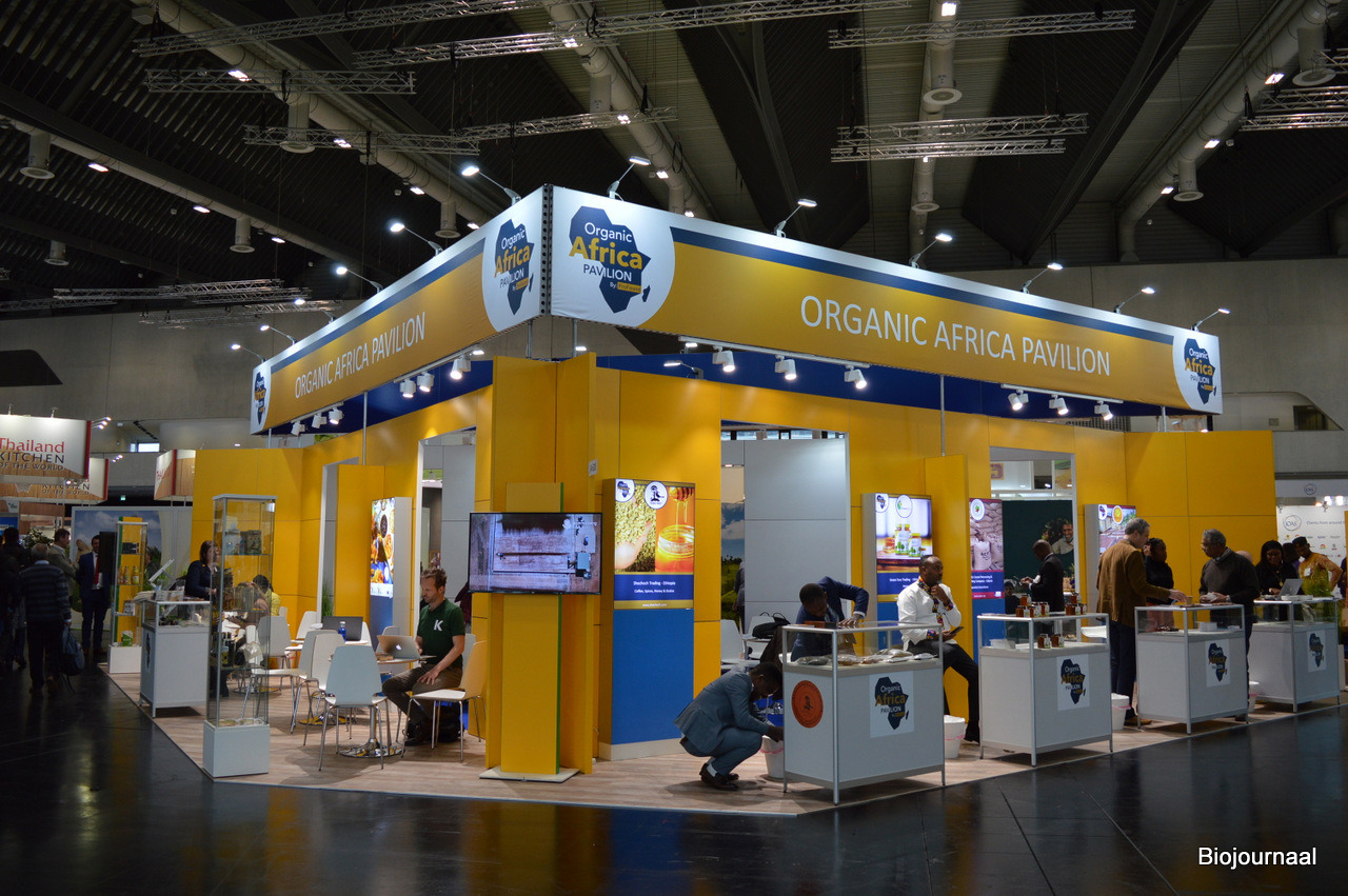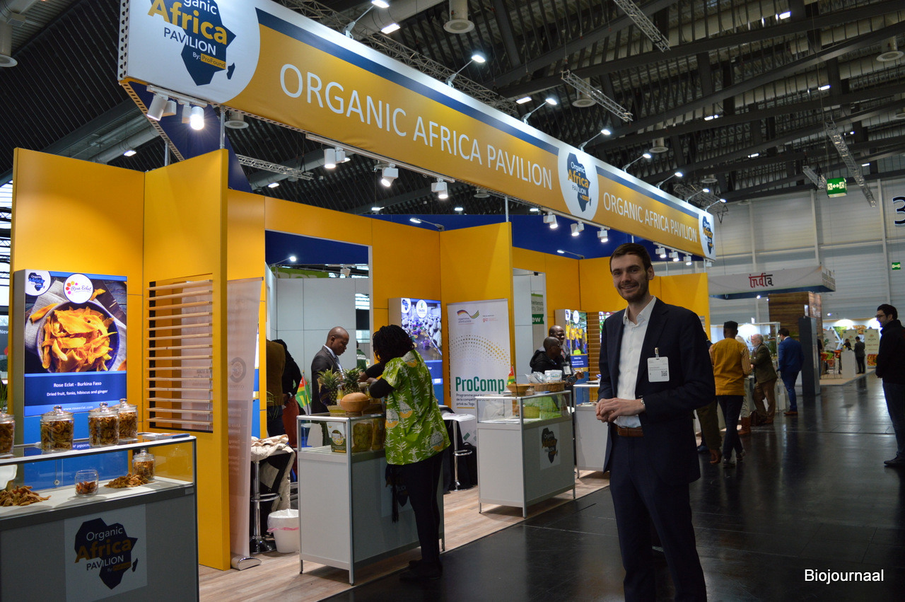 Camiel Drenth met naast hem het door ProFound Advisers in Development georganiseerde Organic Africa Pavilion. Daarop presenteerden 15 Afrikaanse bedrijven hun producten. "Ze vinden het een hartstikke mooie kans om hier te staan."