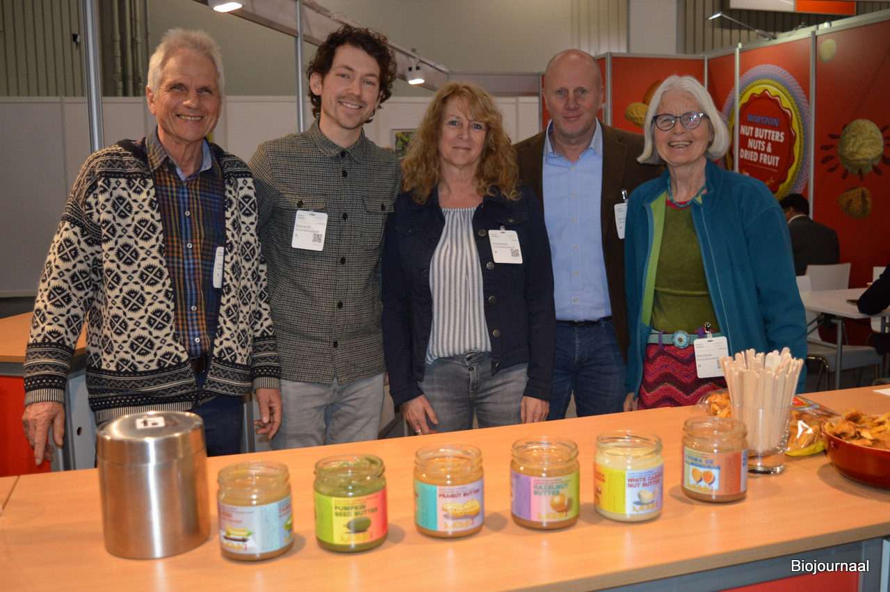 Peter Krijnsen, Claudine Vrooijink, Jordy Bakker, Marlin Wessels en Sven Maesland bij Brinkers Food, dat de nieuwe La Vida Vegan notenpasta's introduceerde (op de voorgrond). Deze notenpasta's hebben een notenaandeel van 85% (hazelnoot-, amandel- en een cashewnotenpasta).