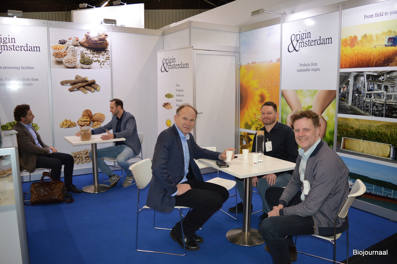 Ook nieuw op de beurs: Origin & Amsterdam. Rechts aan de tafel zijn Arjen Leijener en Dirk Terwel in gesprek met Gerard Versteegh van Tradin. Links zit collega Michel Beekwilder.