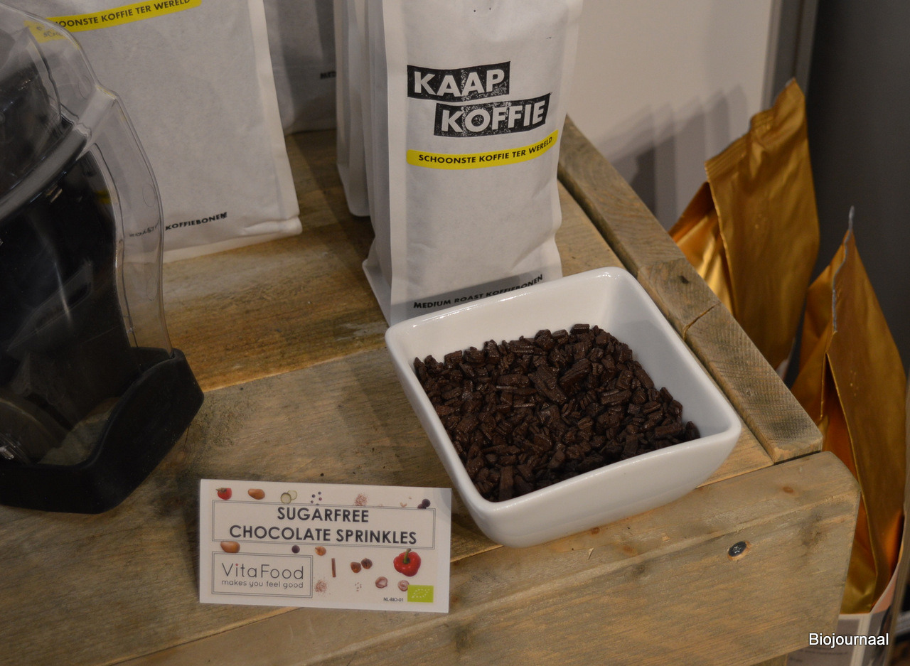 De nieuwe suikervrije hagelslag van IDorganics. Achter dit bakje staan wat zakken met Kaap Koffie, dat sinds kort verkrijgbaar is.