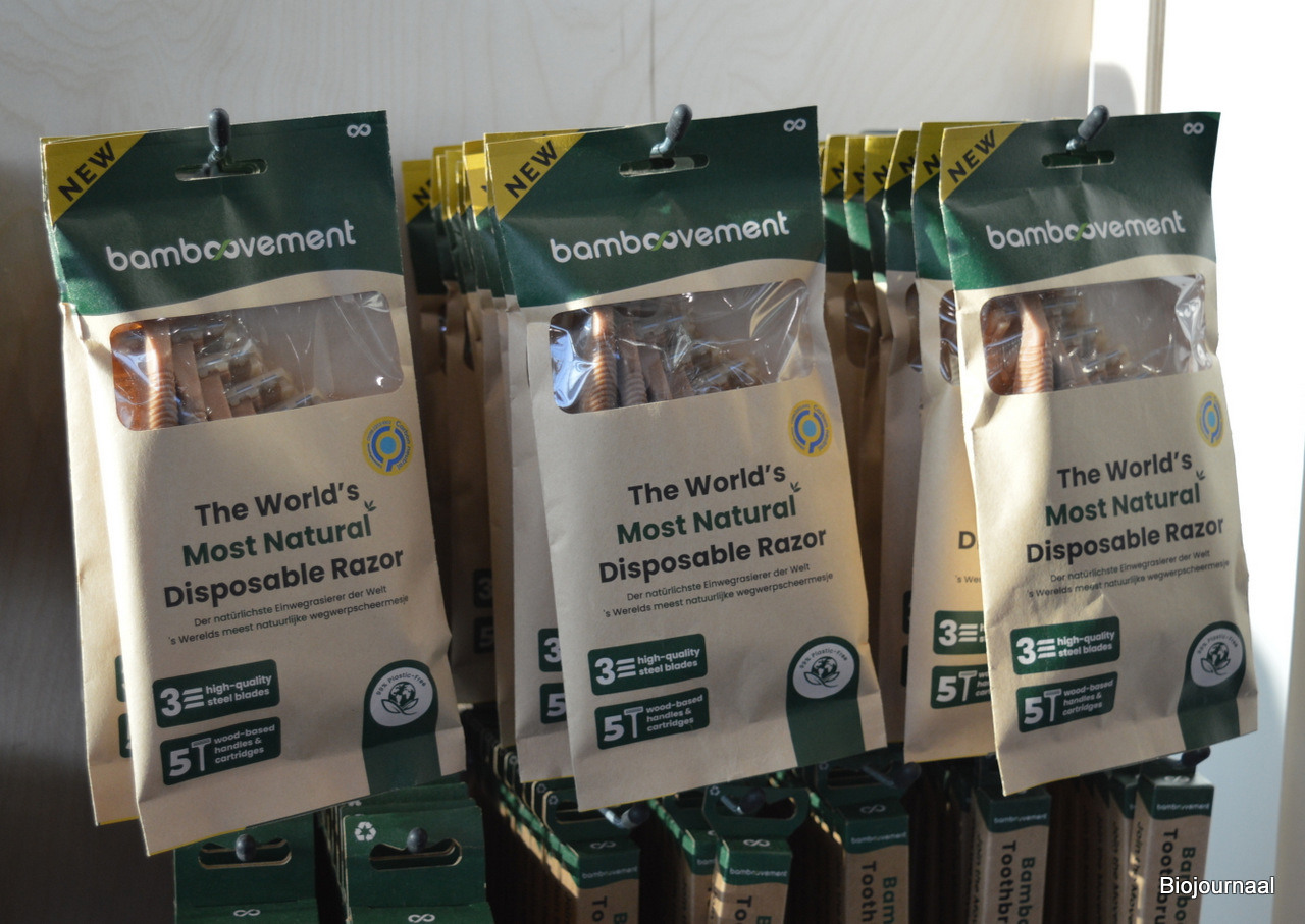 Joshua en Ainu van den Hurk presenteerden bij The Bamboovement de duurzame scheermesjes die voor 99% plastic vrij zijn (links en geheel rechts op de foto). Volgens hen 's werelds meest natuurlijke scheermes. Tussen hen in staan Frank Koch en Jonathan Berhani. Jonathan is van Happy Tabs, dat plasticvrij poetsen met tabletten mogelijk maakt.