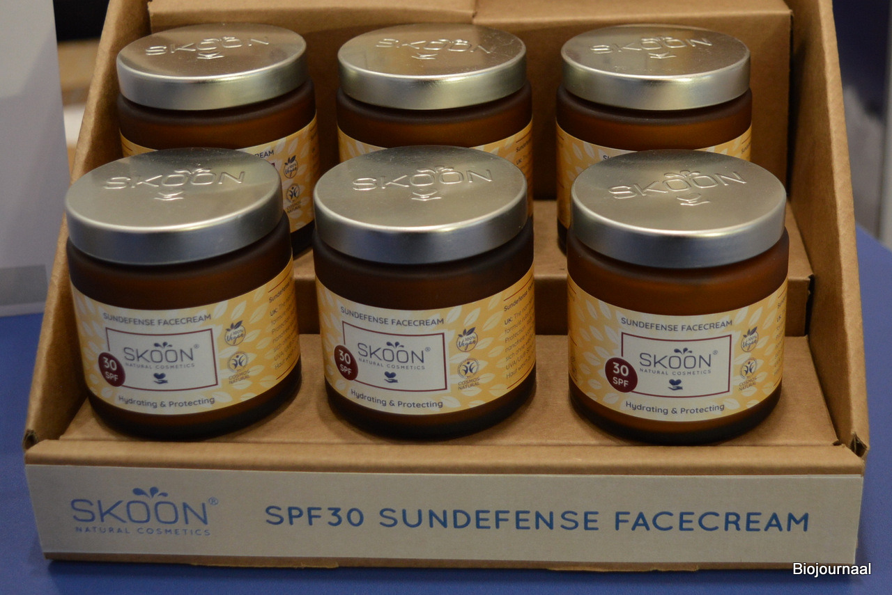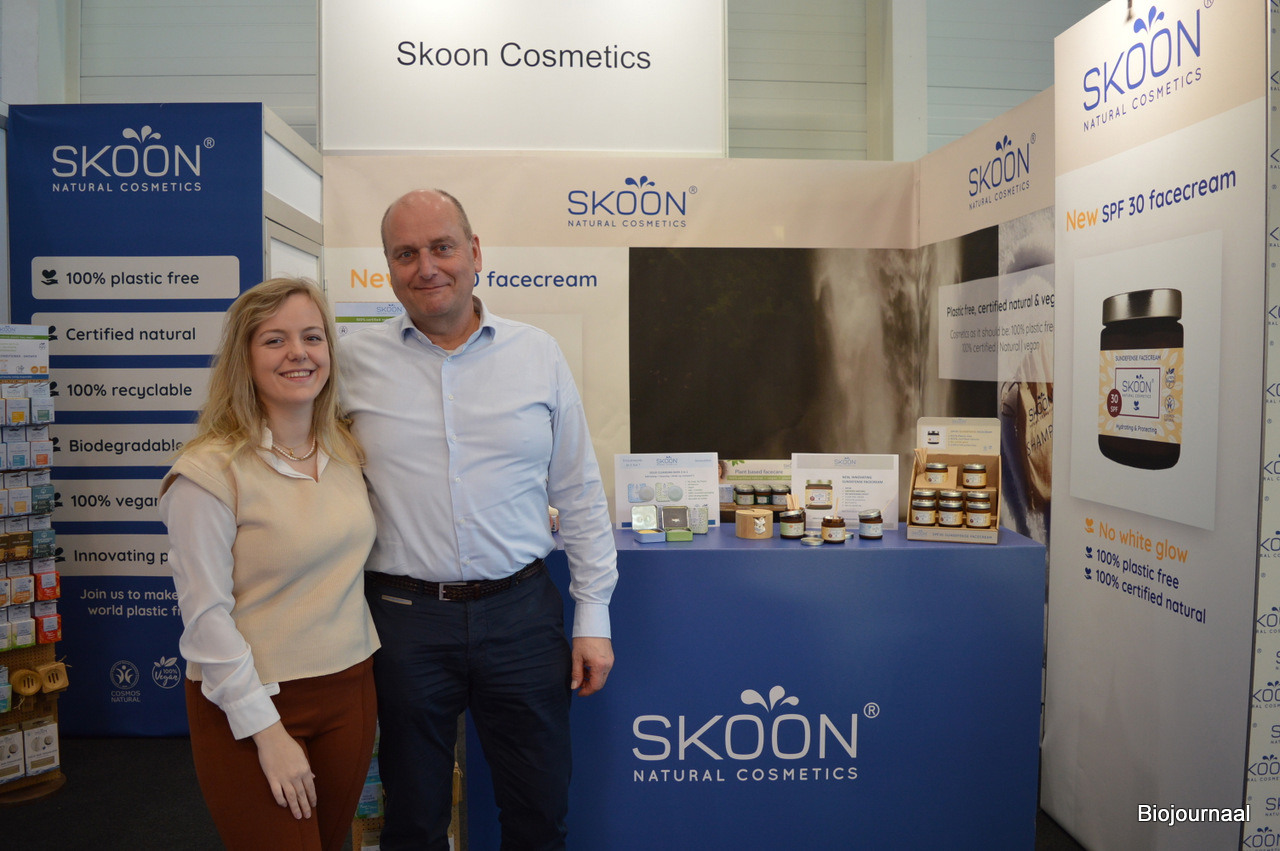 Rob van der Leegte met zijn dochter Carlijn bij Skoon Cosmetics. Hij presenteerde een nieuw product, dit bleef een verrassing tot aan de beurs. Het gaat om SPF 30 sundefense facecream.