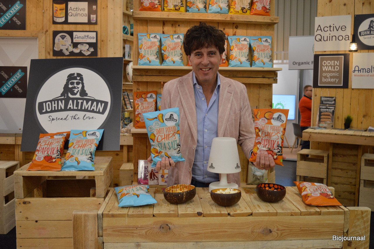 Arnoud Francken toont de nieuwe biologische Sweet Potato Chips van John Altman, in de varianten Sea Salt en Smoked Paprika. "Iedereen is enthousiast over de nieuwe smaken. Crisp neemt ze op in het assortiment."