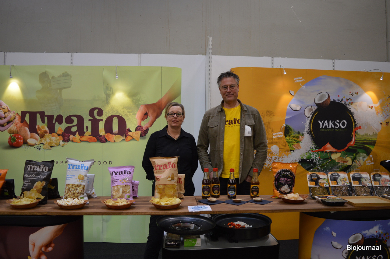 Namens FZ Organic Food: Janet Nuijten en Bjorn Andringa. FZ liet op de beurs de producten van Trafo in de nieuwe uitstraling zien. En de nieuwe producten van Yakso: Groente krupuk, sea sauce, een vegan alternatief voor oyster sauce, hoisin sauce en gehakte knoflook in pot. Proeven kon men van seitan voor in de koeling.