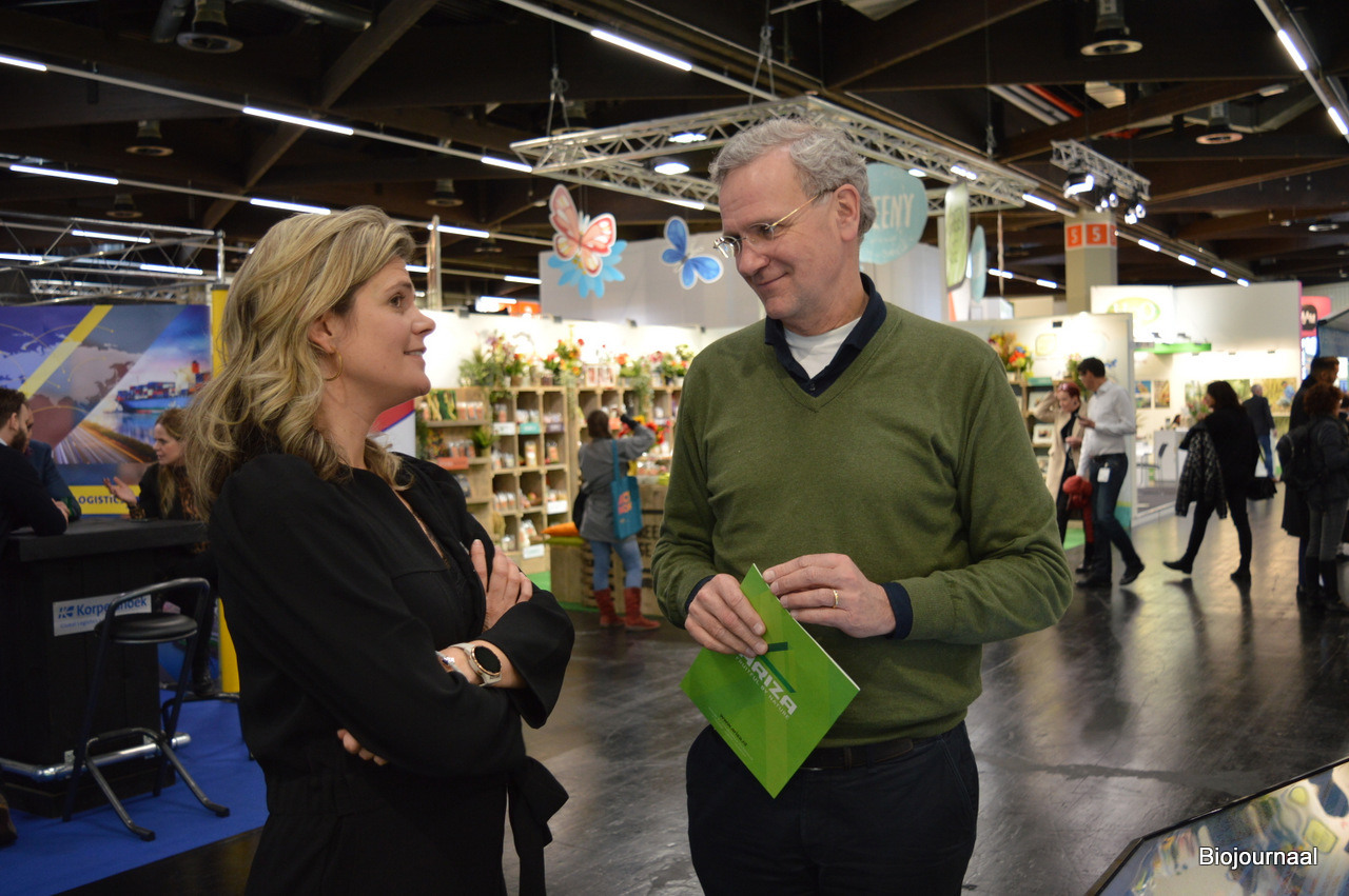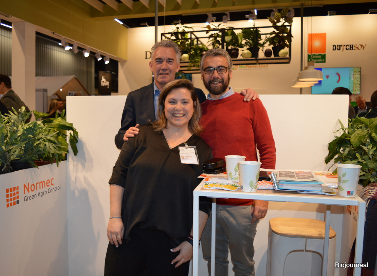 Michel Witmer en Slvia Toutziari van Normec Groen Agro Control kregen Natxo Deelvira van Galab Lab Espana op bezoek. Michel: "Mooi dat we in deze ruime stand weer met zijn allen samen kunnen staan." - hiermee doelt hij op het feit dat Green Organics, Dutch Soy, De Smaakspecialist, De Groene Weg en Flevosap in 1 stand stonden.
