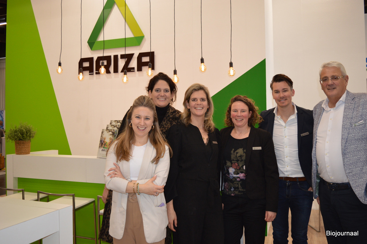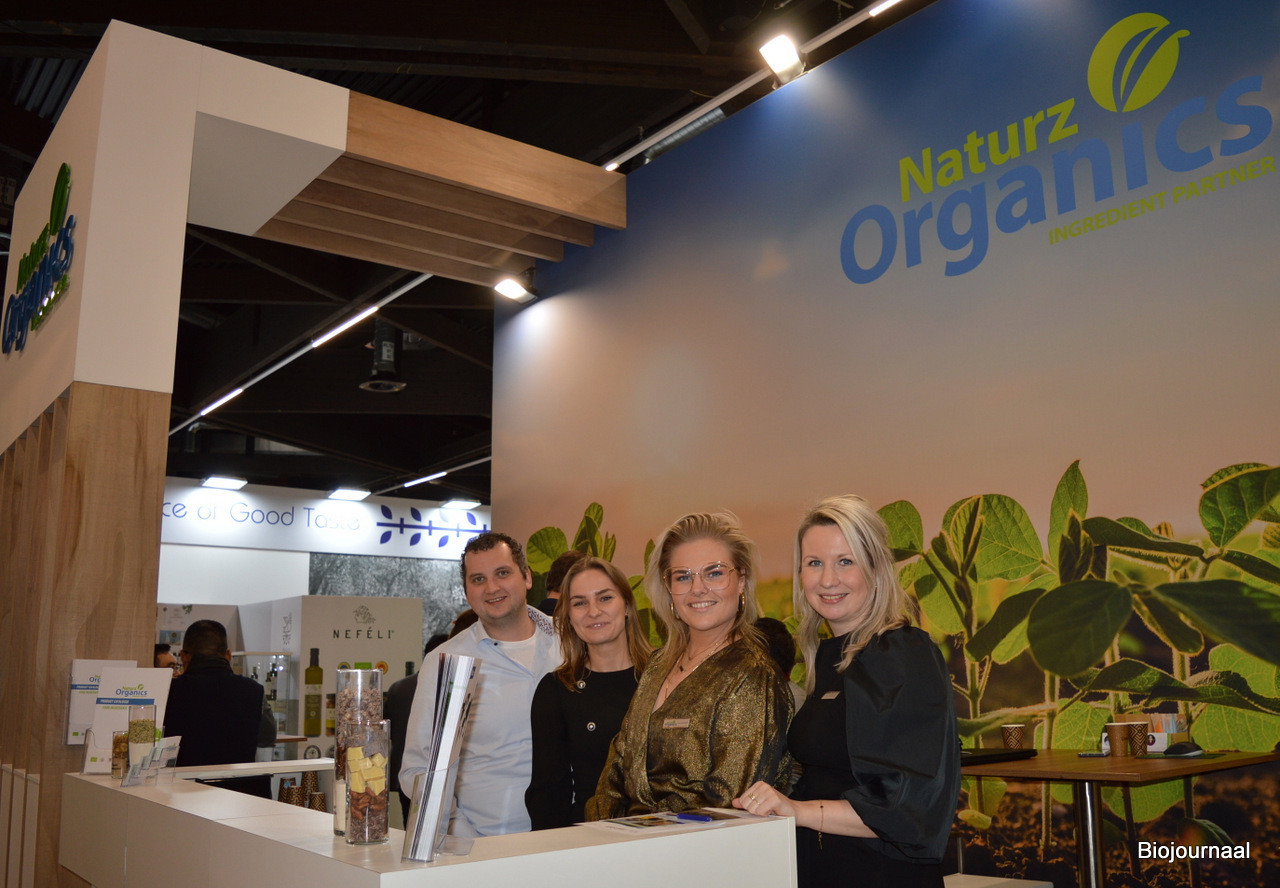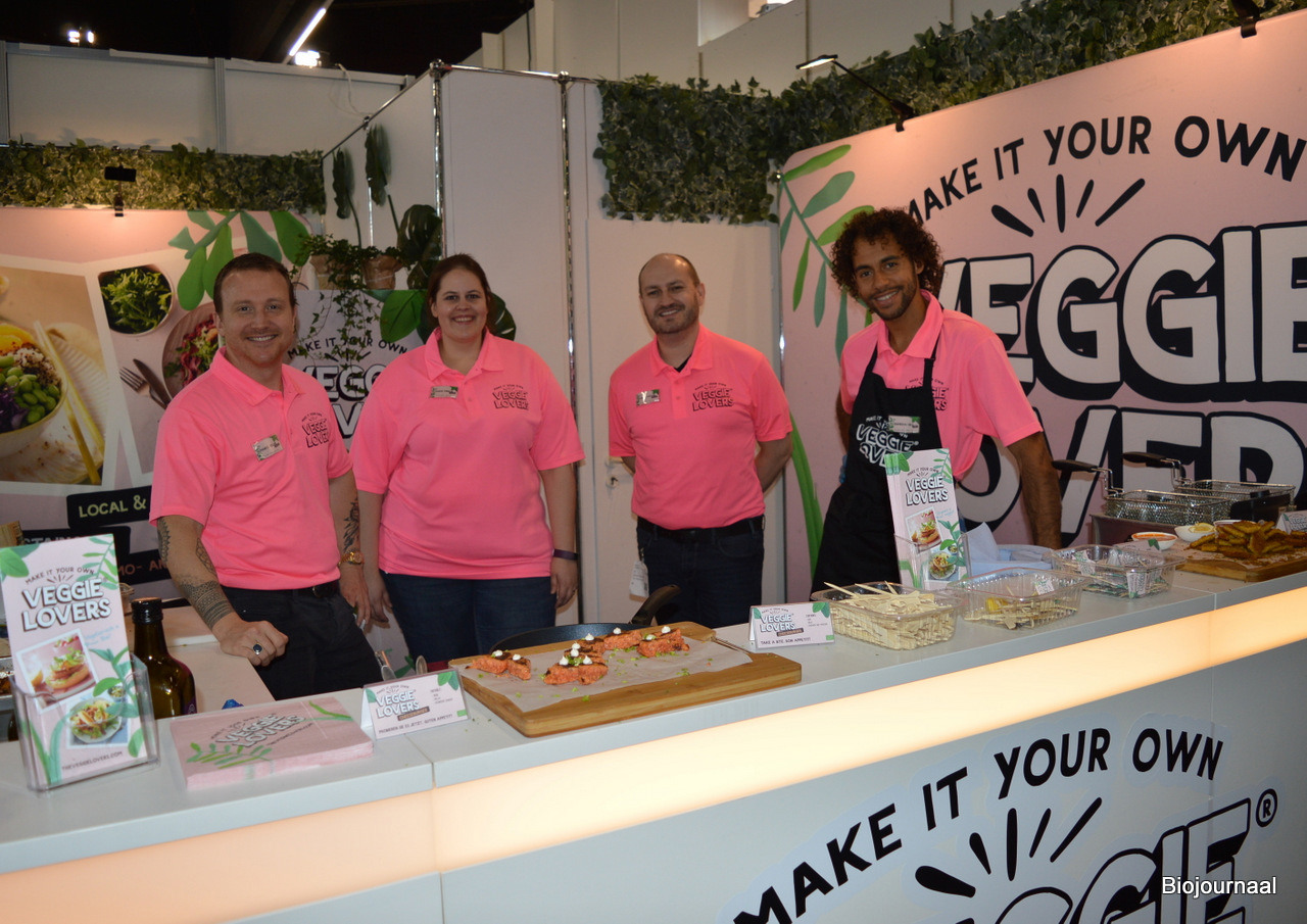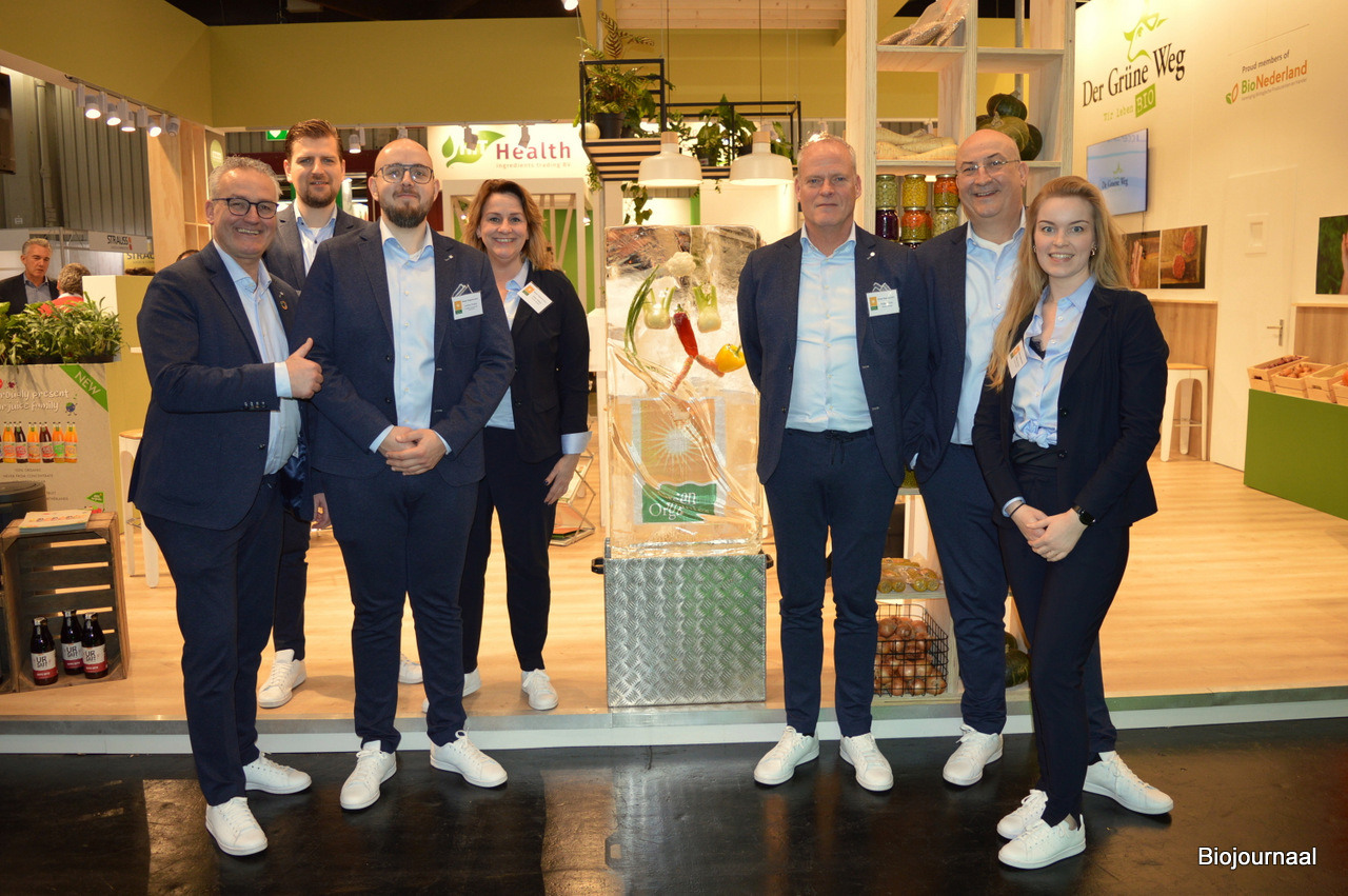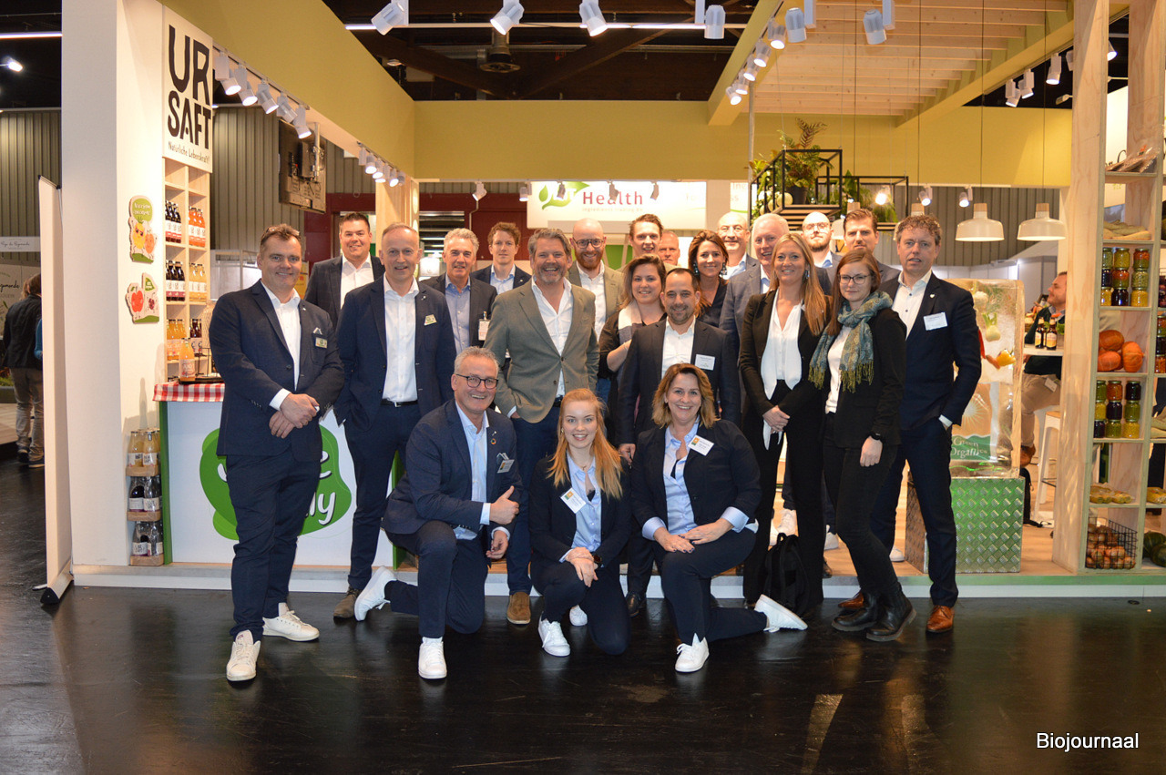 Uitgebreide groepsfoto bij de combi-stand van Green Organics, Dutch Soy, De Groene Weg, De Smaakspecialist, Normec Groen Agro Controle en Flevosap.