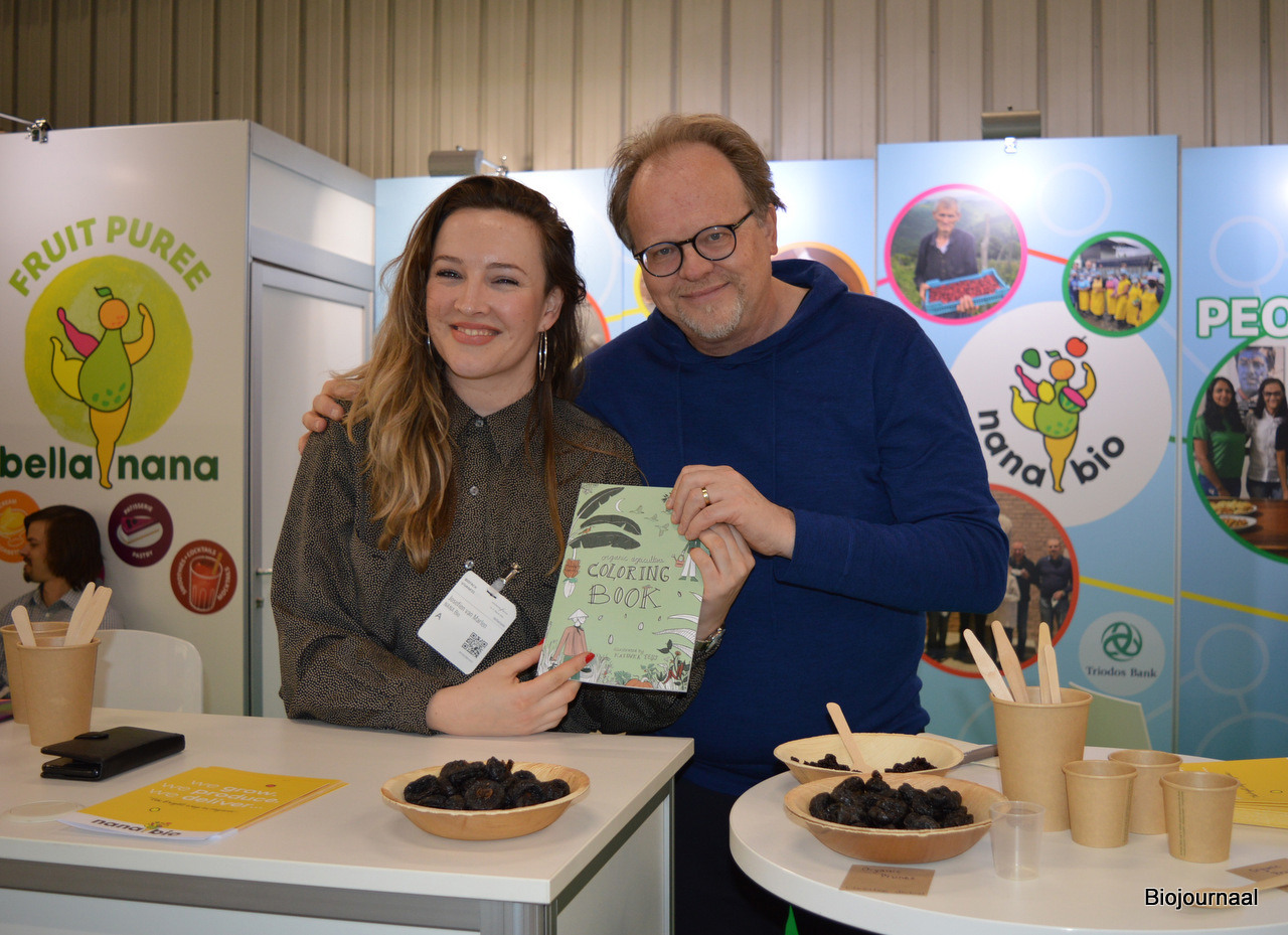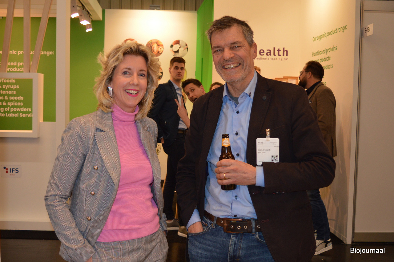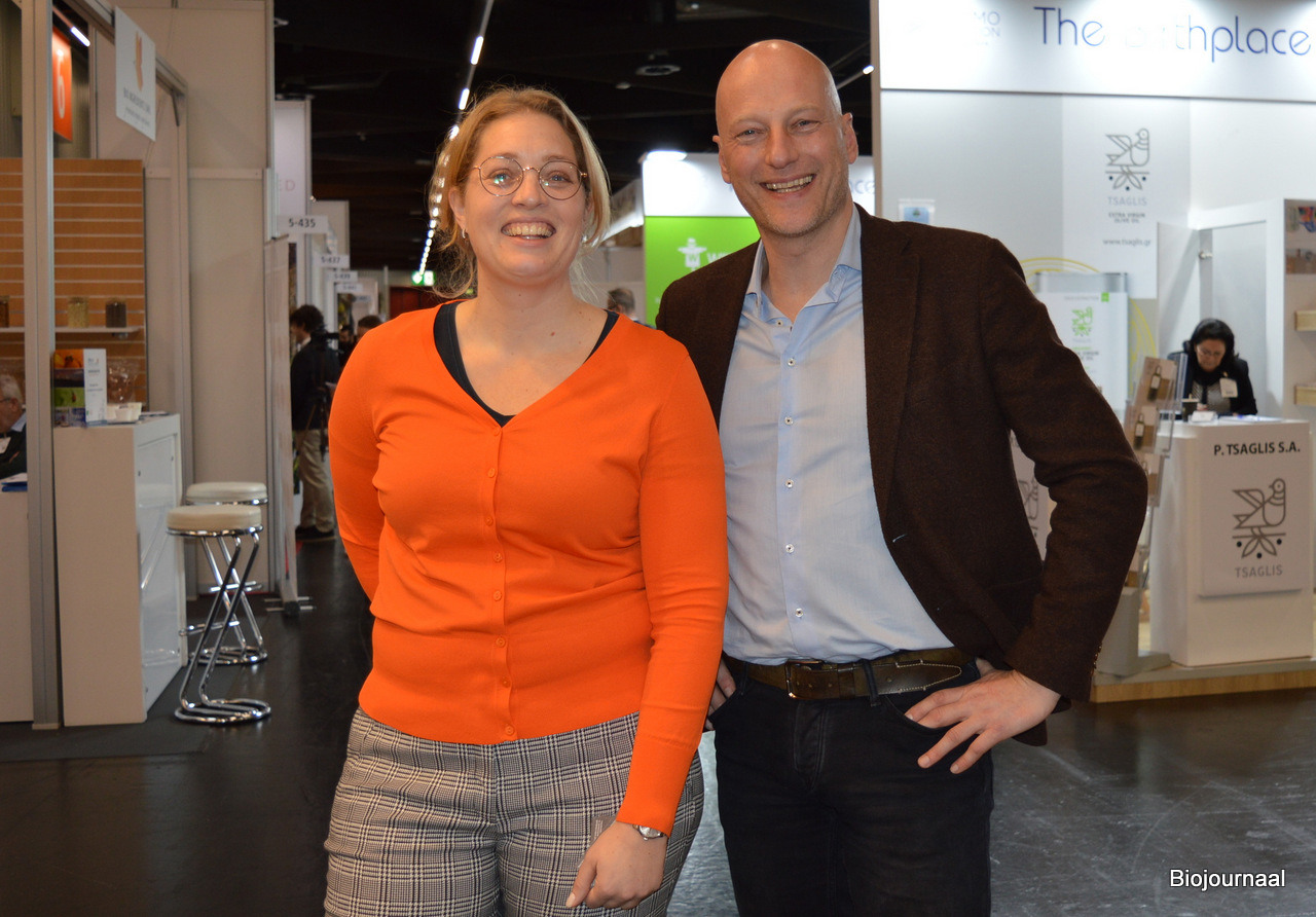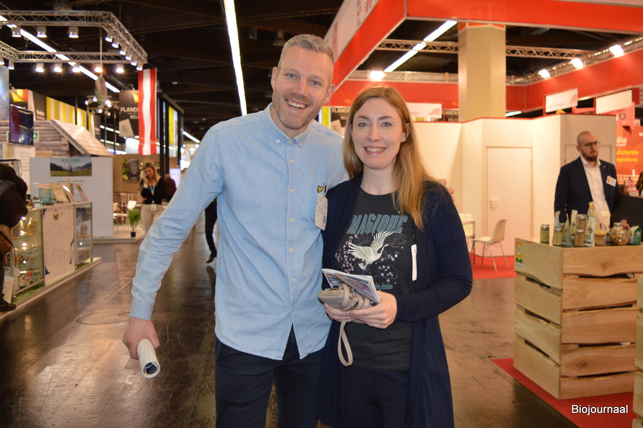 Danique de Boer en Jan Wolf bij Machandel, dat het assortiment van eigen merk Gutnuss uitgebreid met een witte cashewpasta, een zwarte sesampasta en drie soorten pindakaas. Danique: "We zijn heel blij met deze nieuwe plek in hal 7. We hebben bewust foto's van onze fabriek toegevoegd om te laten zien dat wij een productiebedrijf zijn."