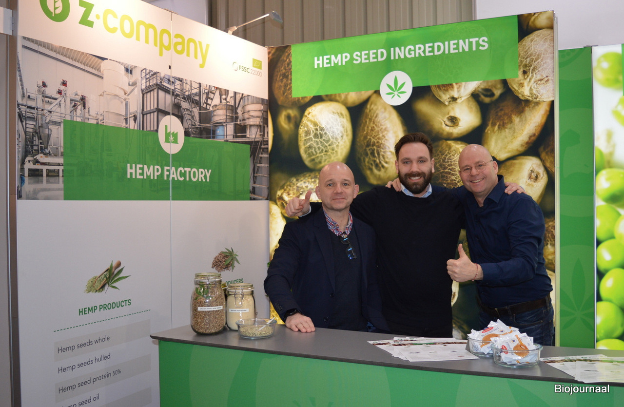 In de stand van Z-company: Roger Weijters, Mitchell van Dongen en Flip Estourgie. Mitchell: "Z-company is de enige hennepzaadfabriek in Nederland, we zijn sterk in plantaardige proteïne."