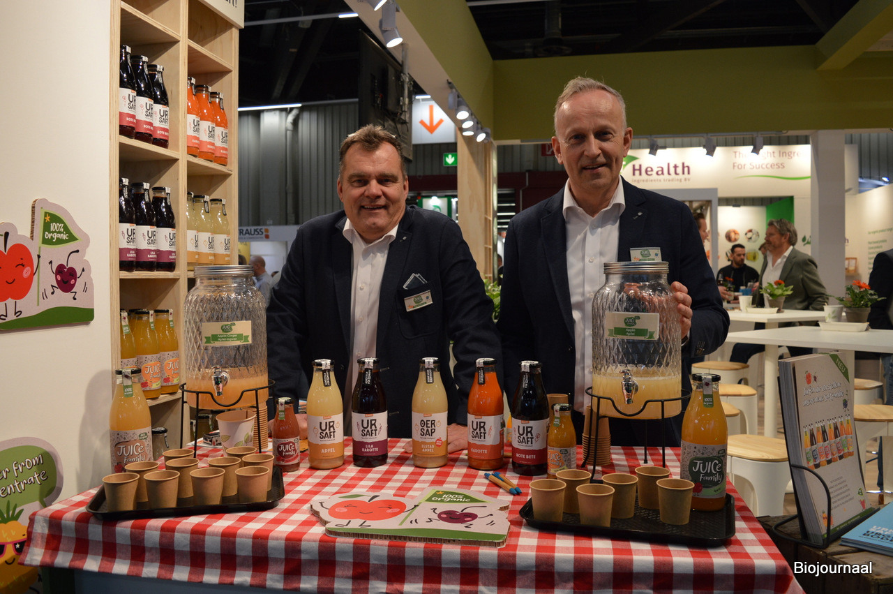 Wyno Vermeulen en Alex Poortinga vulden bij Flevosap de hele dag door bekertjes met de biodynamische OERsappen, ofwel URsaft in het Duits.