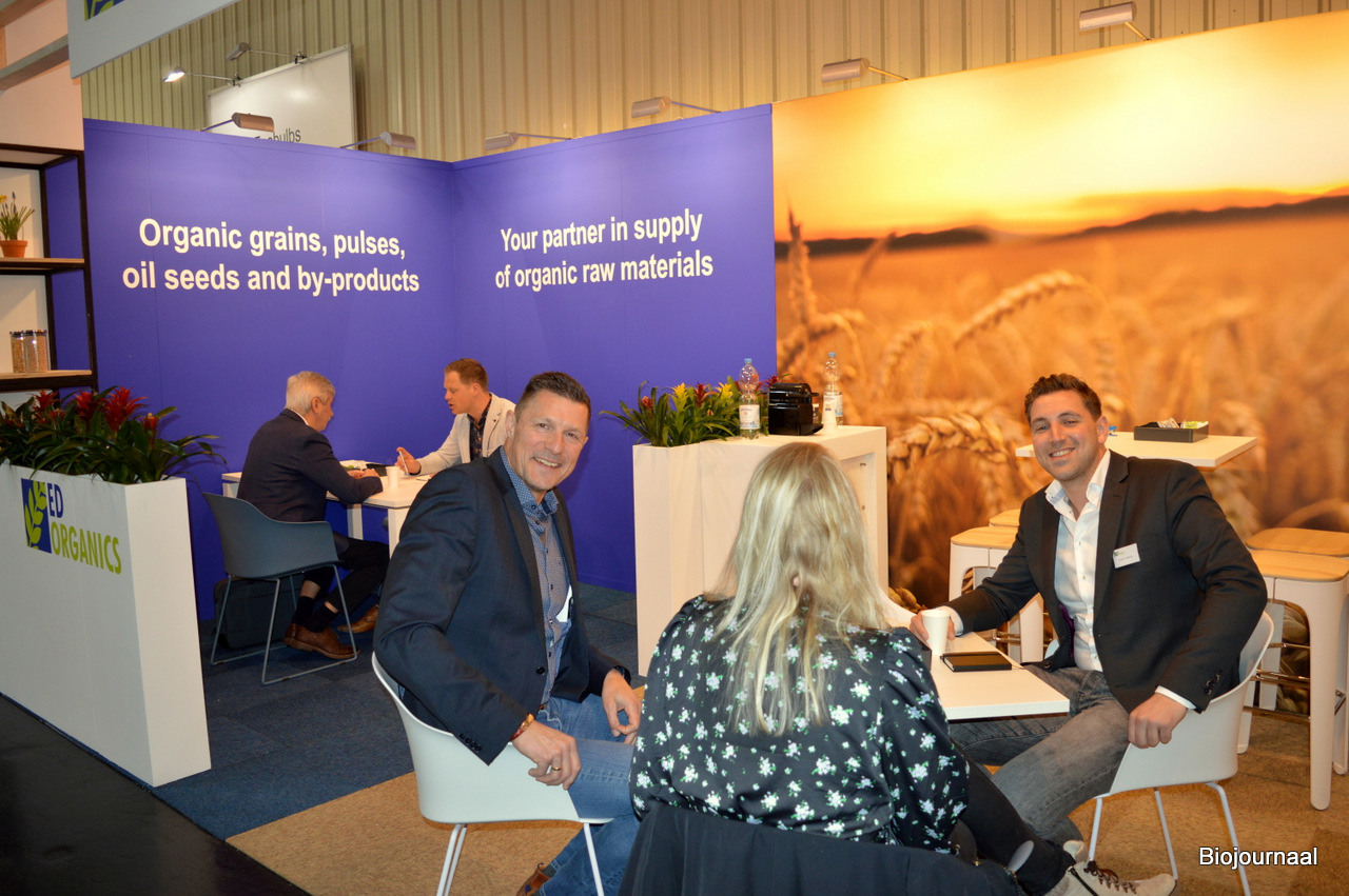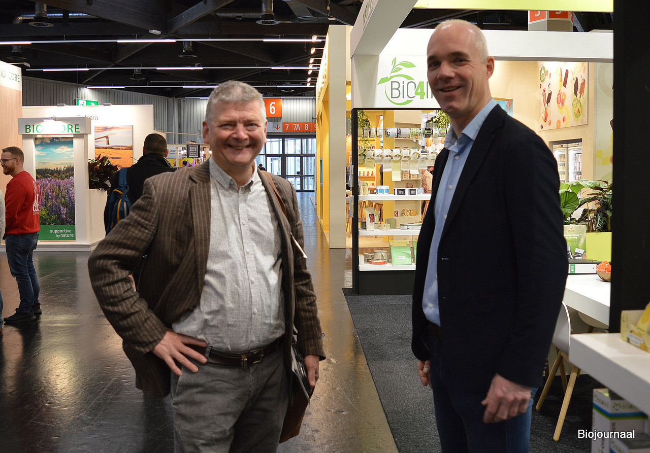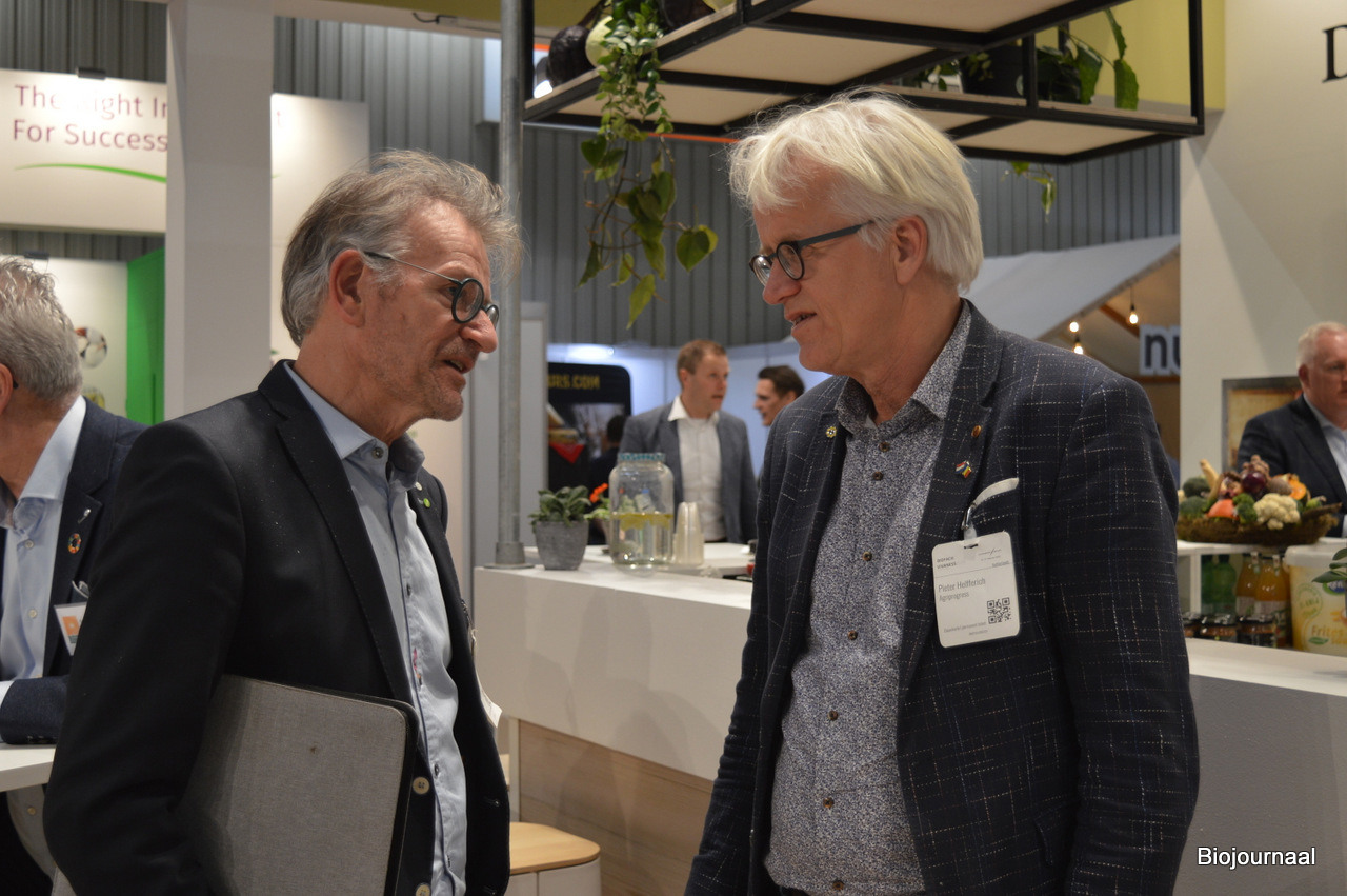 Jetse Schokker (IDorganics) praat bij met oud-collega Rob van Santen (nu Tradin Organic Agriculture).
