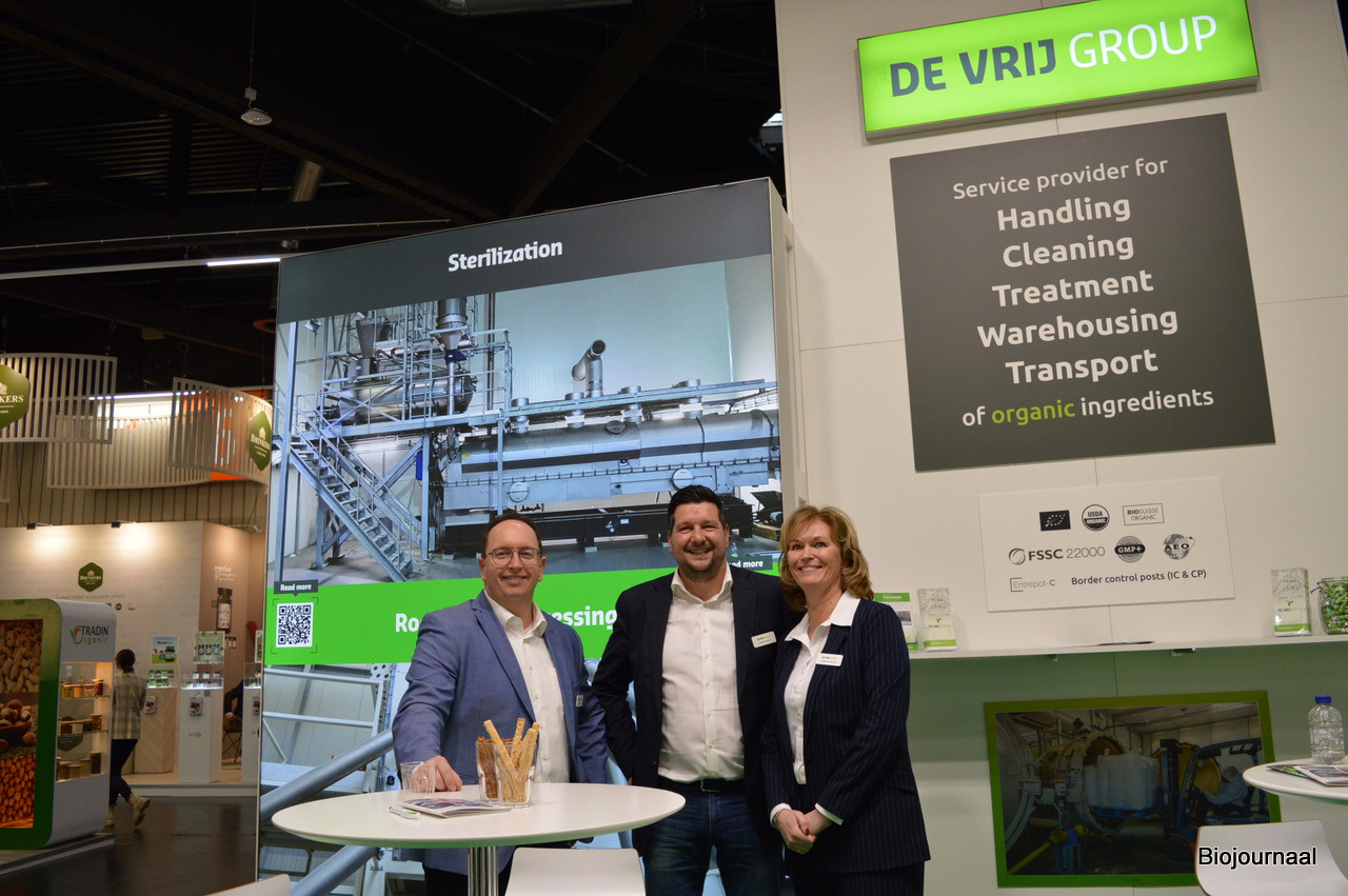Arjan Wit, Dennis Minnaard en Hélène van der Wal bij De Vrij Group. Onder meer gespecialiseerd in CO2 behandeling van product in containers. De Vrij Groep kan ook producten steriliseren in een allergenenvrije omgeving. Deze behandelmethode is geschikt voor diverse ingrediënten, waaronder biologische grondstoffen.