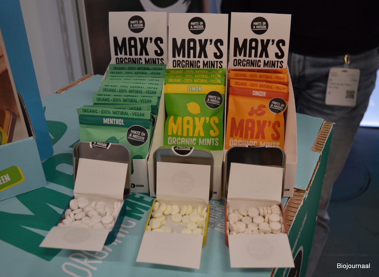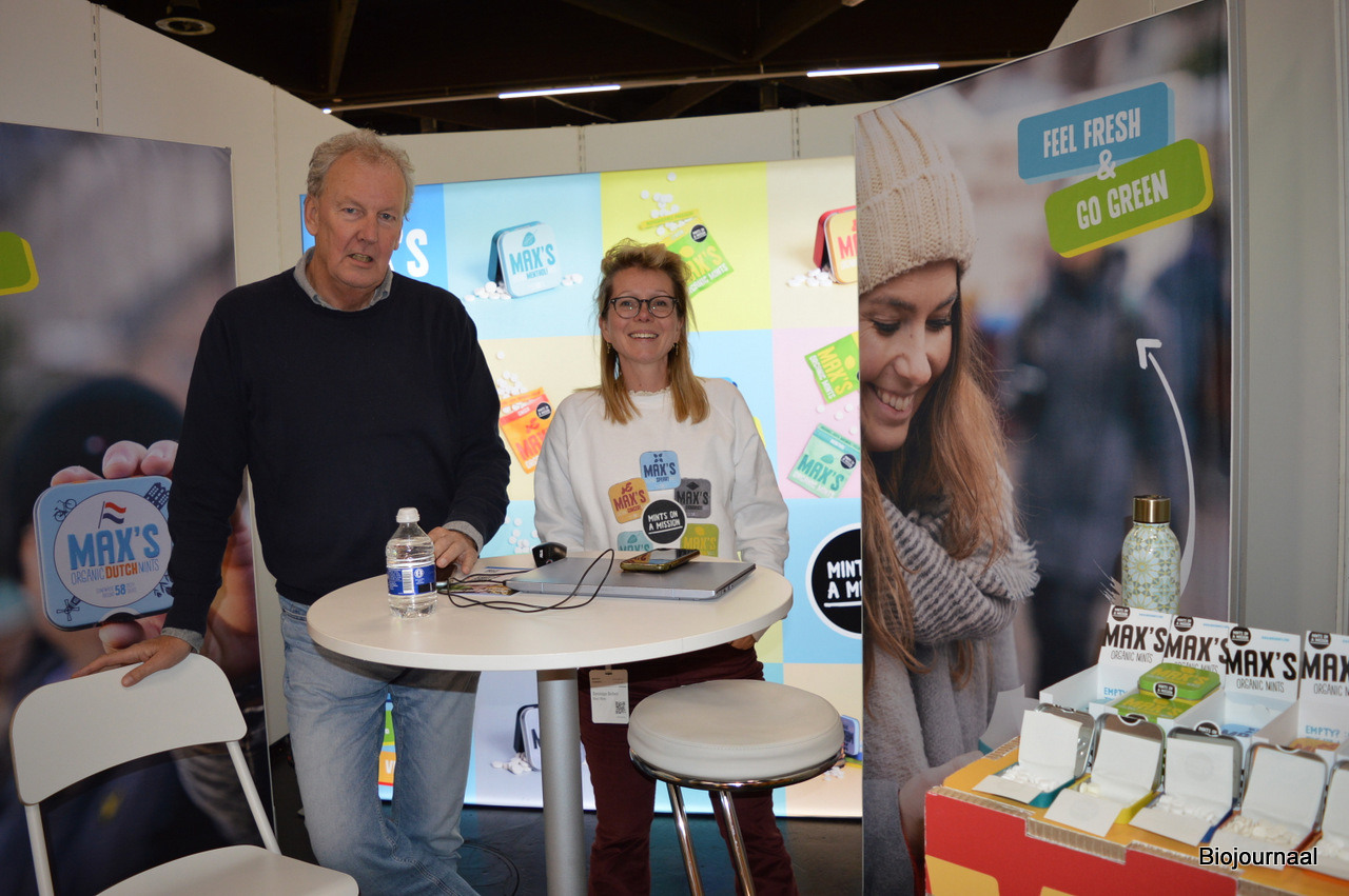 Pieter van der Steen en Dominique van Zon vertegenwoordigde Max's Organic Mints. Pieter: "De kwantiteit van de bezoekers is tot nu toe niet heel oké, de kwaliteit wel. We hebben al veel goede contacten gelegd, dat is natuurlijk het belangrijkst."