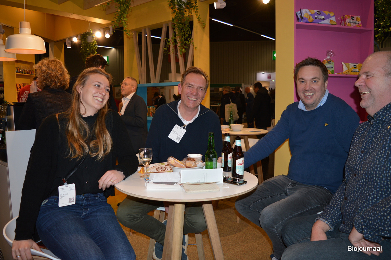 Tijd voor een hapje en een drankje in de Udea-stand. Kim Huppertz en Ton Severrien (GreenSprout) met Pieterjan Kok (Good Foods) en Jan Wolf (Machandel).