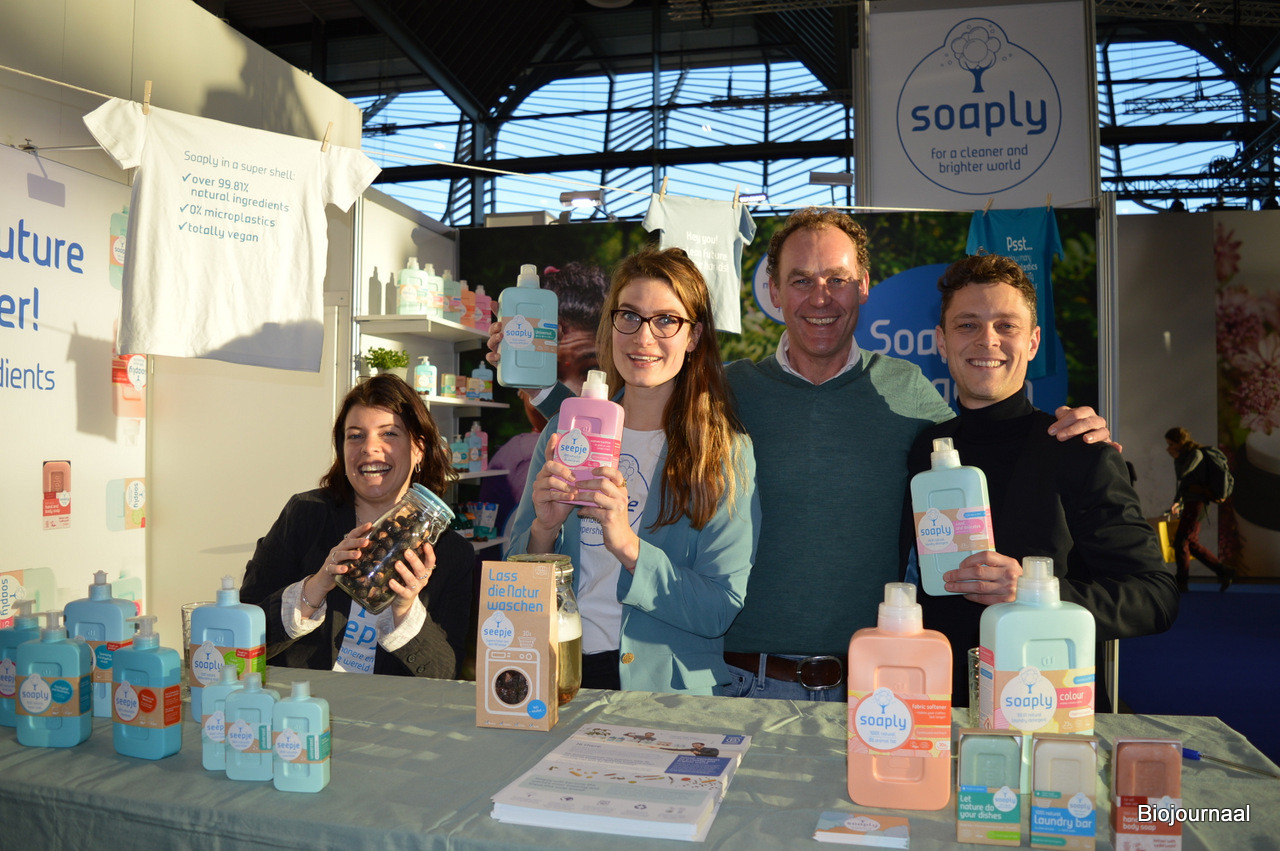 In het zonnetje in de Vivaness-hal (3C): Seepje (Soaply in Duitsland). Seepje is onlangs een samenwerking aangegaan met Eco Group. Dit bedrijf neemt de activiteiten van Seepje in Duitsland en Oostenrijk over. Op de foto: Anisa van der Hoek, Milou Kruijsdijk, Daniël Beenink en Stephan Lutkeholzik. Milou: "Eco Group staat hier om het hoekje, daardoor kunnen we geïnteresseerde partijen meteen doorverwijzen."