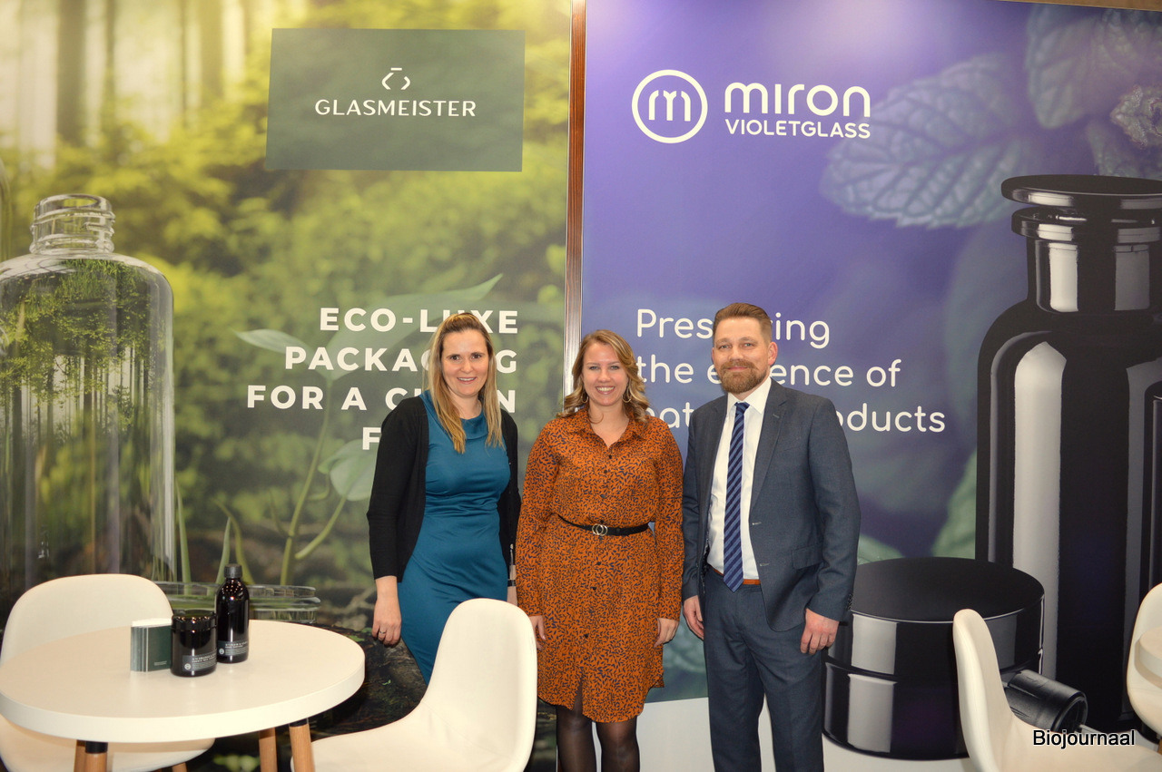 Miron Violetglass deelde de stand met Glasmeister. Magdalena Miotk, Mark Cremer en Marijn van der Linden poseren voor de camera van Biojournaal. Steffen geeft aan dat de merken elkaar mooi aanvullen.