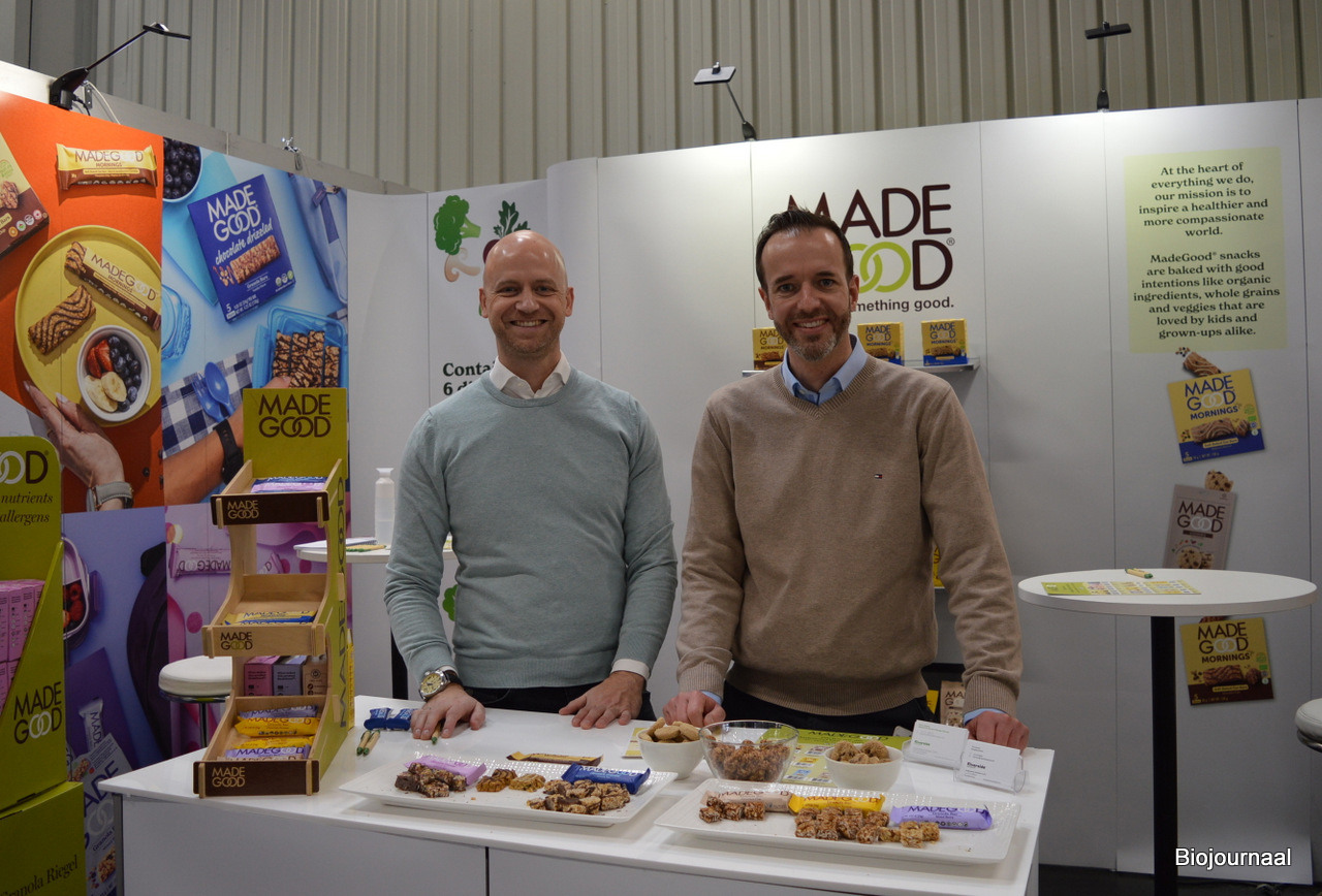 Tim Laarman en Patrick Spieker tussen de producten van MadeGood bij Riverside International.