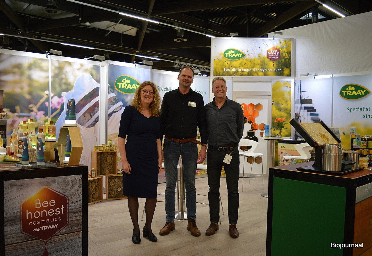 de Traay presenteerde o.a. de nieuwe duurzame verpakkingen van Bee honest. De komende maanden gaan nog meer producten over op deze verpakking. Op de foto: Marloes Kort, Dennis van Teylingen en Lex Drost. Dennis: "En er is nog meer nieuws: Alnatura heeft bee honest opgenomen."