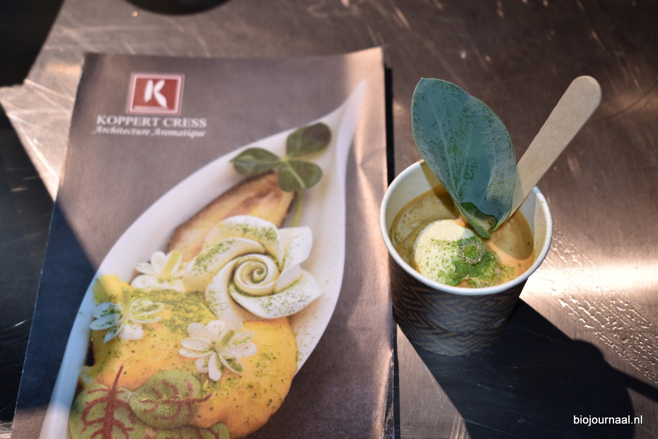 Een plaatje, deze affogato, met oesterblad, kefir-lime poeder en zilte blinkblossom deze kregen de bezoekers te proeven bij Koppert Cress