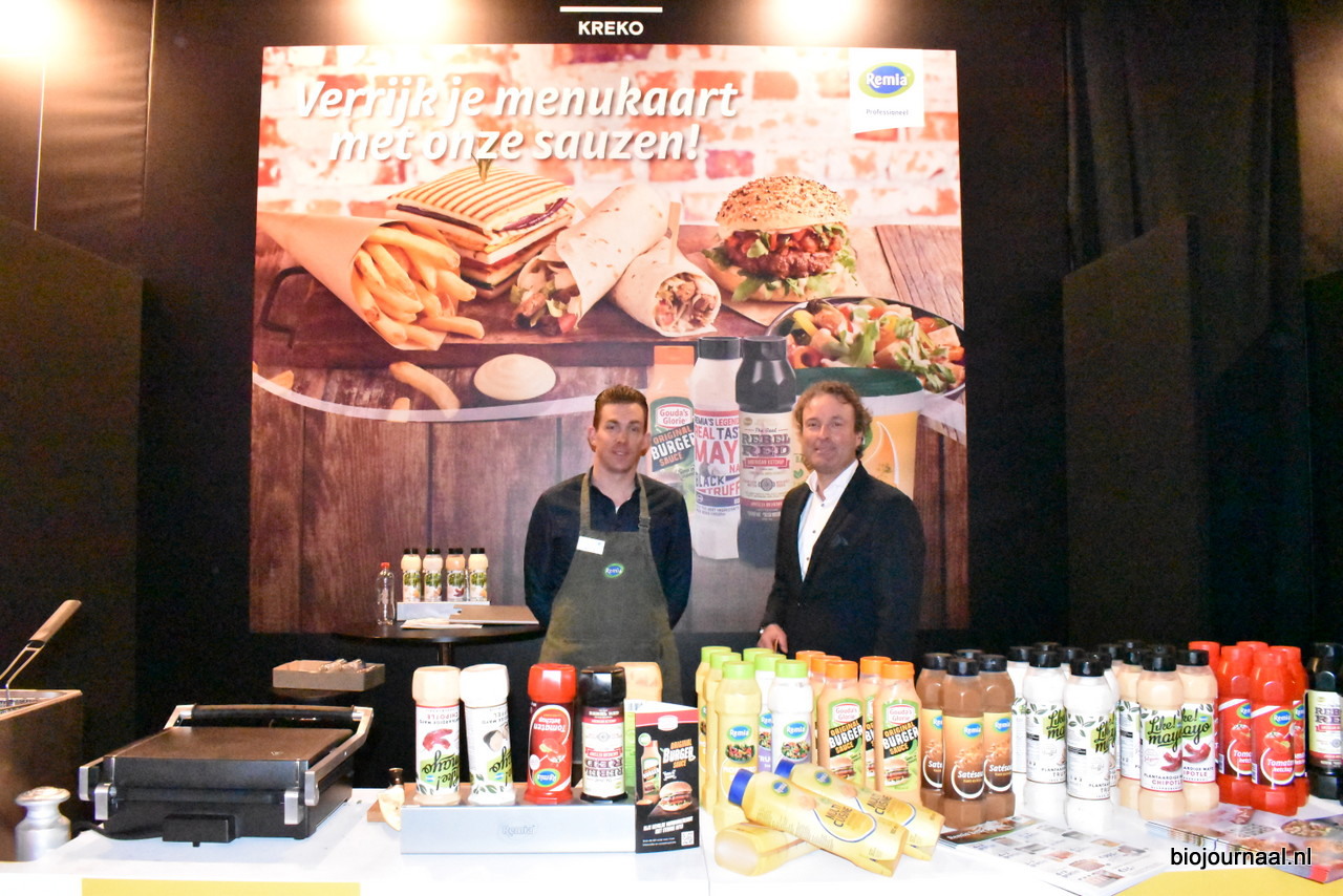 Remia heeft nog steeds een biologische mayonaise in het assortiment die gebruikt wordt bij een aantal slagerijen van de Groene Weg. Op de foto Bram van Heumen en Dennis Bouwmeester