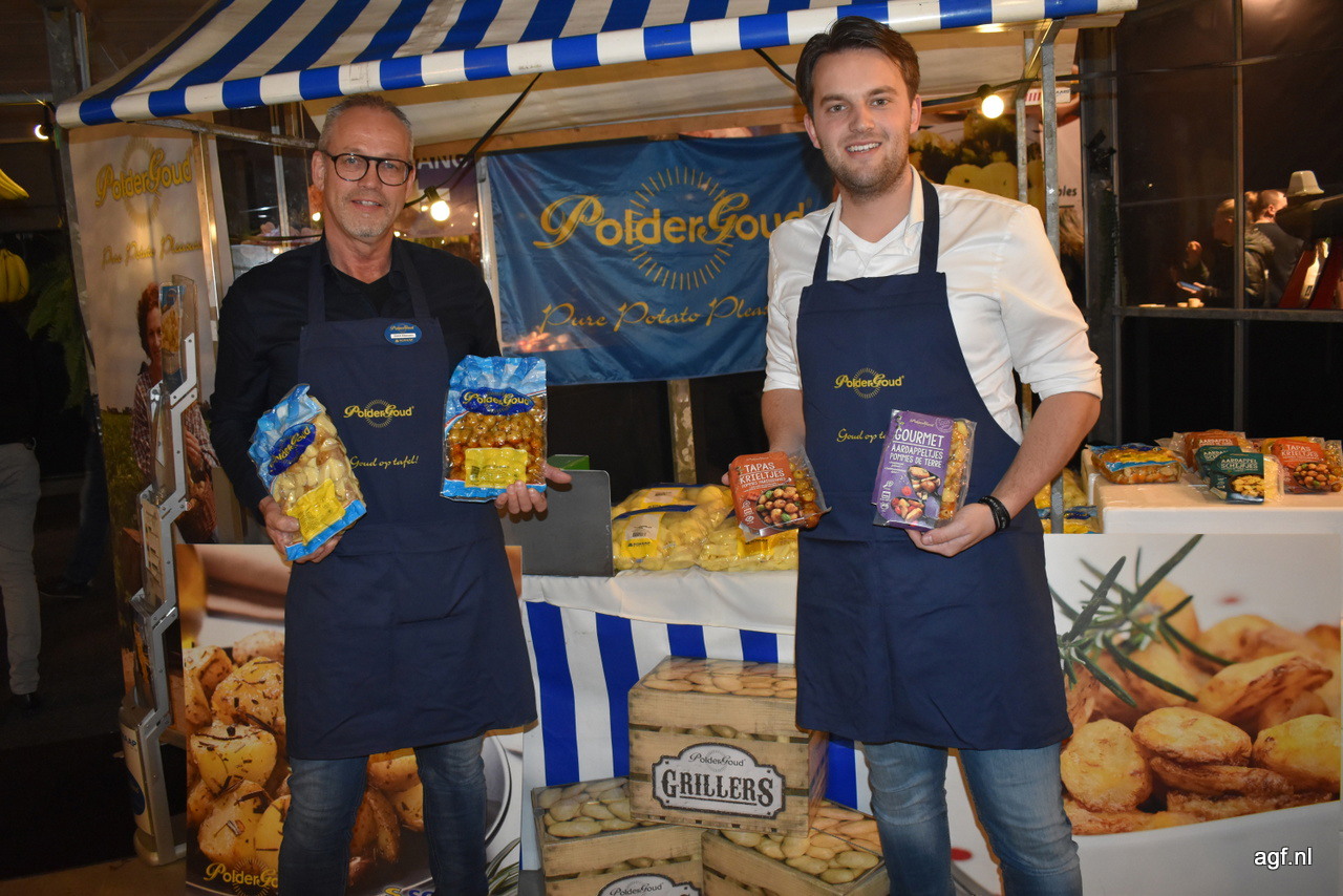 Van Schaap Holland Geert Klaessen en Raimo van Gastel met het gemaks-assortiment voorgegaarde aardappelen in groot en kleinverpakking