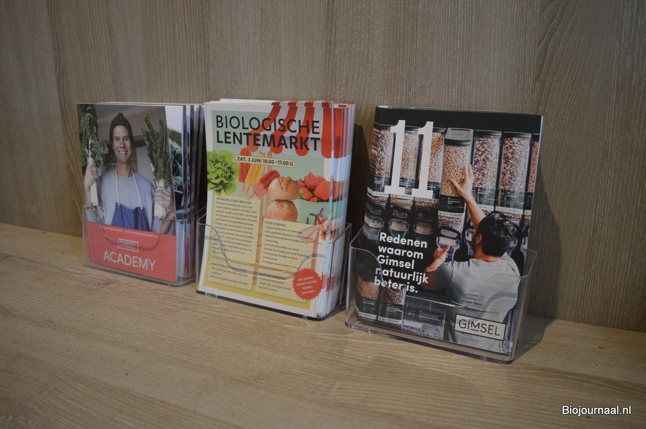 De flyer van de Lentemarkt tussen de andere Gimsel-flyers (Academy en 11 redenen waarom Gimsel natuurlijk beter is).