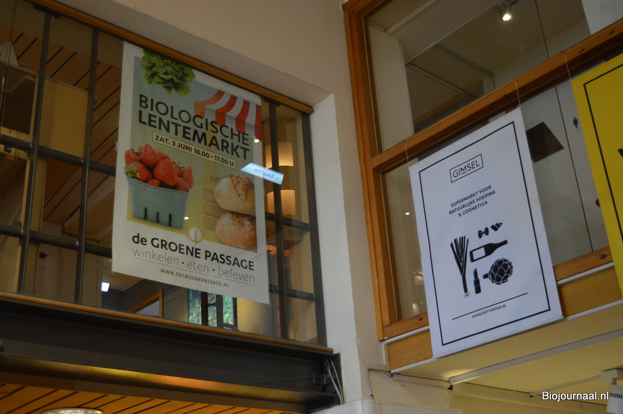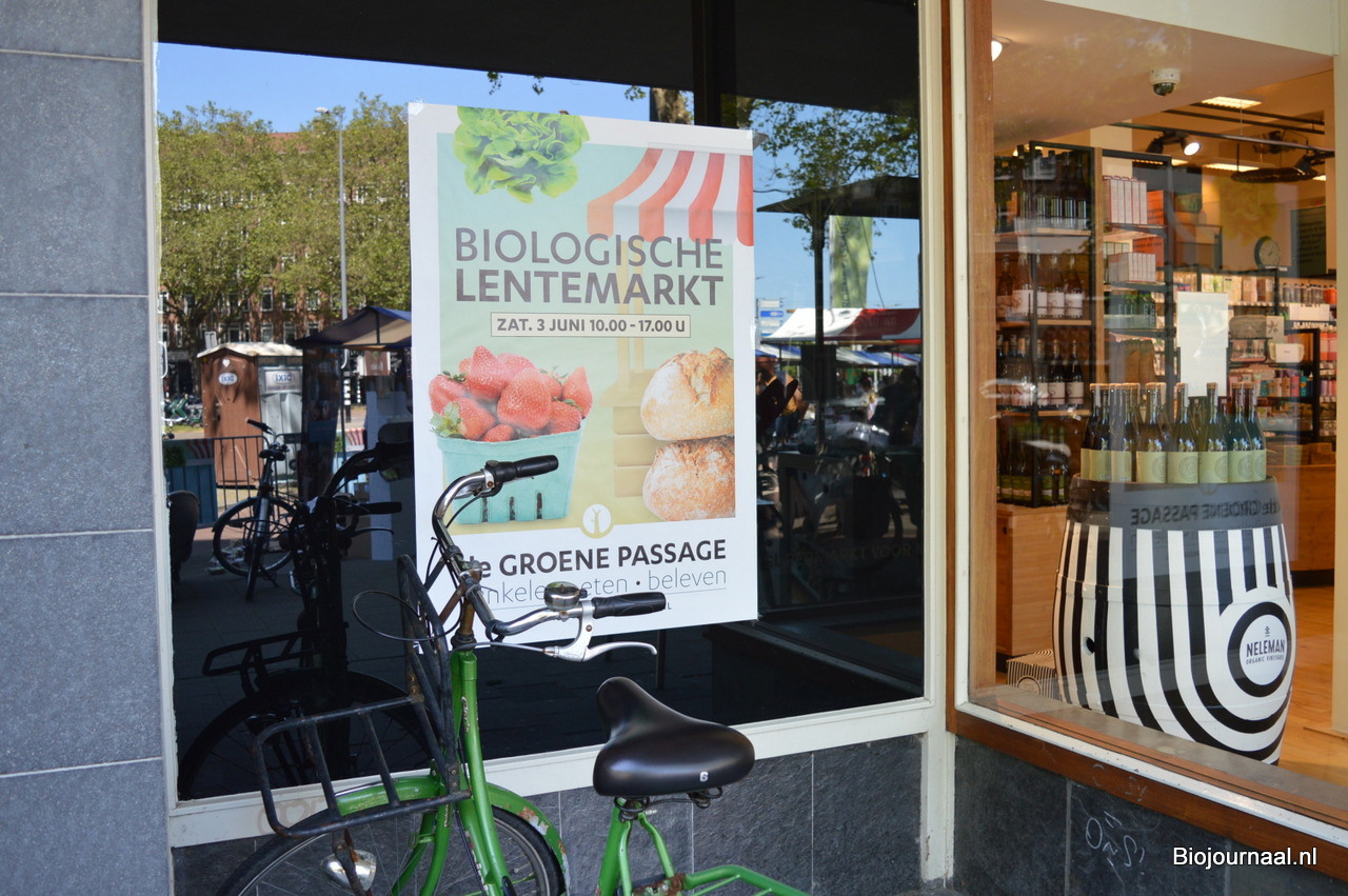 Ook bij de bio-supermarkt binnen werd natuurlijk reclame gemaakt voor de Lentemarkt.