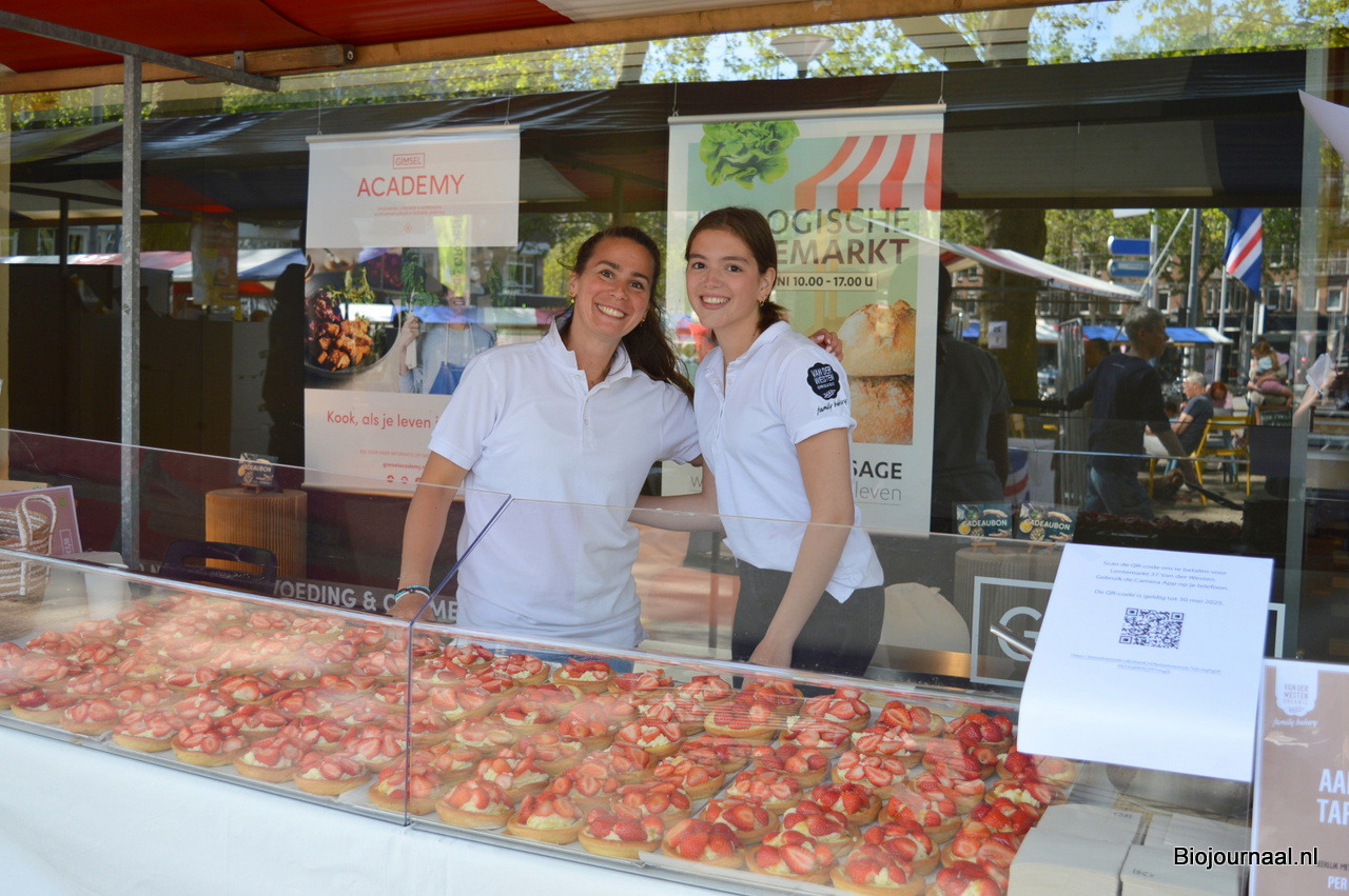 De Lentemarkt zou de Lentemarkt niet zijn zonder de aardbeien tarteletjes van Van der Westen Organic family bakery. Op de foto: Wendy van der Westen en haar nichtje Kiera van der Westen.
