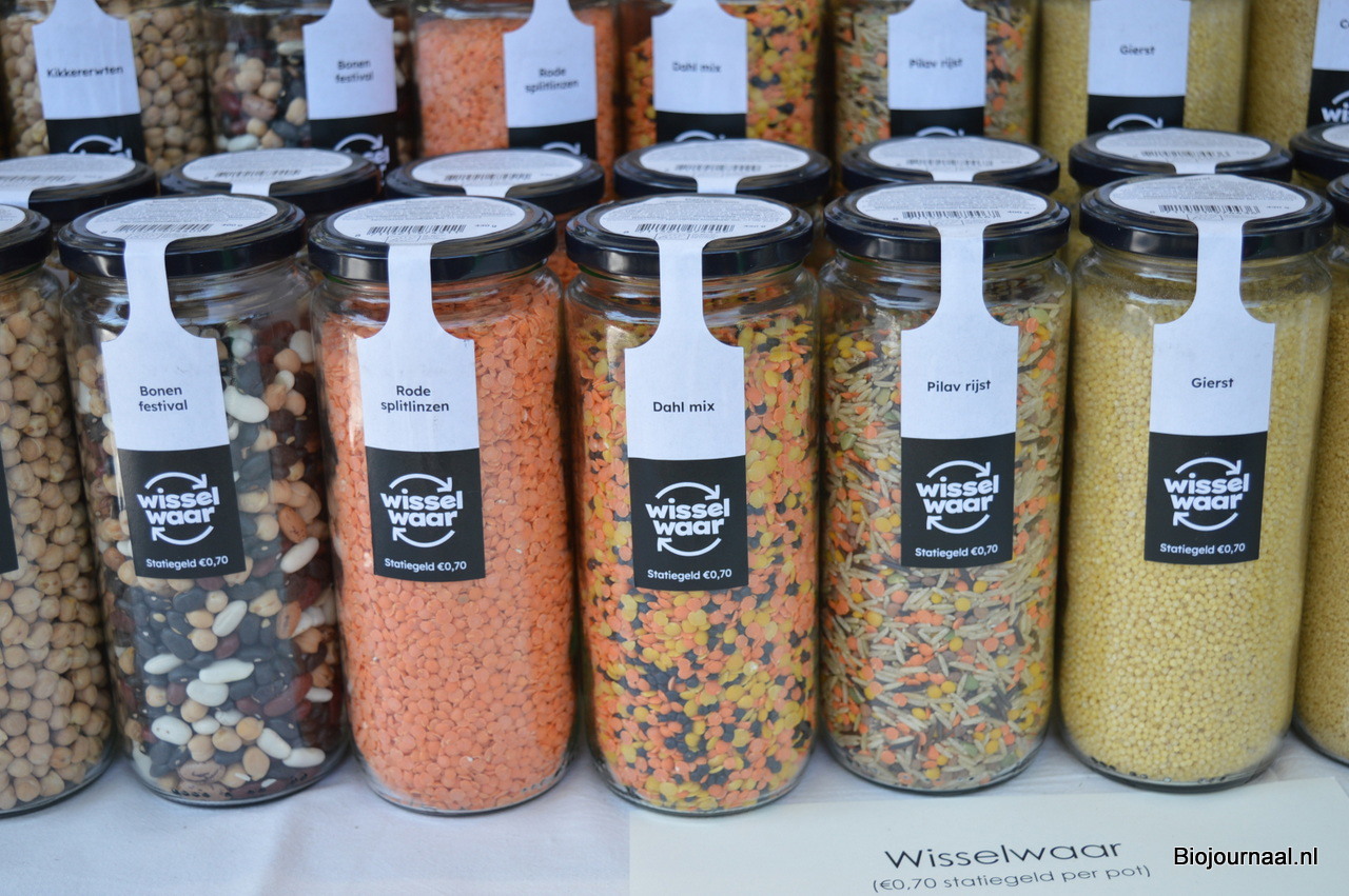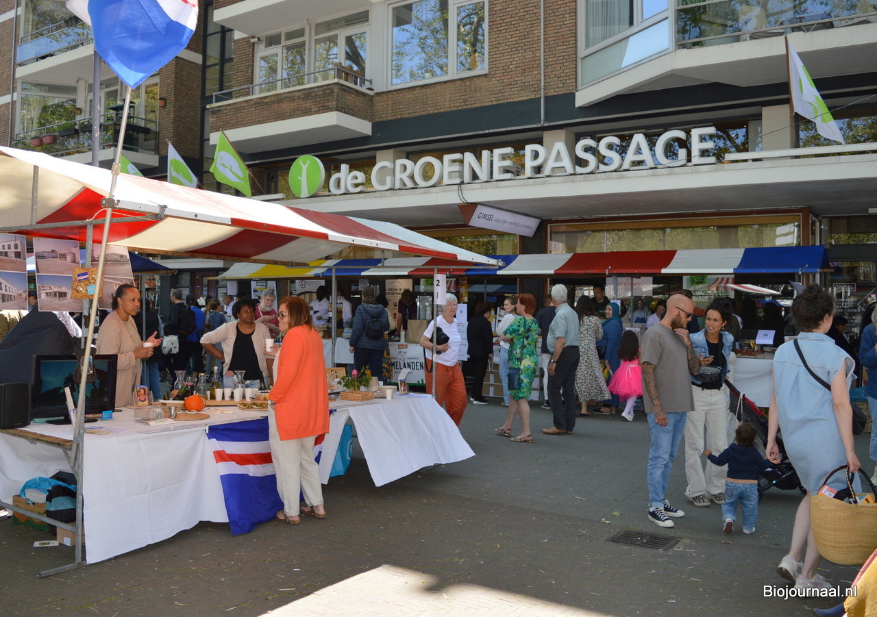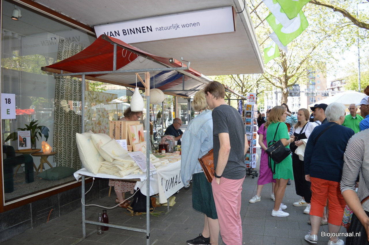 De twee kramen links zijn gevuld met producten die bij 'Van binnen - natuurlijk wonen' (ook gevestigd in De Groene Passage) verkrijgbaar zijn.