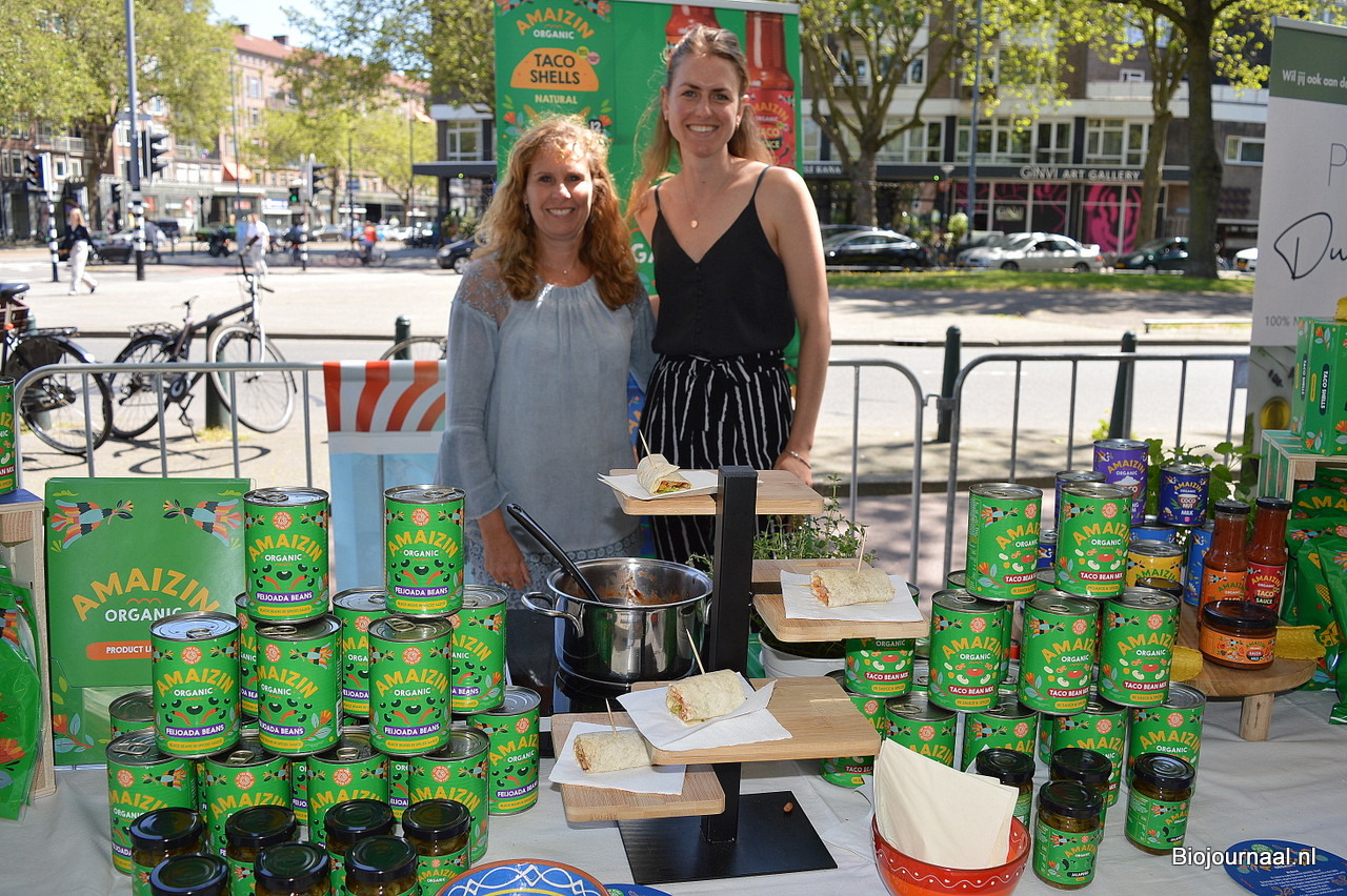 Dorinda Hoogerwaard en Rhodee Stalfoort van Do It Organic met op de voorgrond de nieuwe taco bean mix en de feijoada beans.