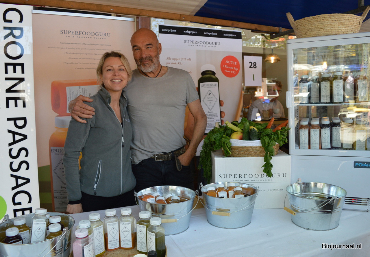 Jojanneke Leistra en Kung Wha Cheung bij Superfoodguru. Zij bieden allerlei koudgeperste sappen en raw foods.