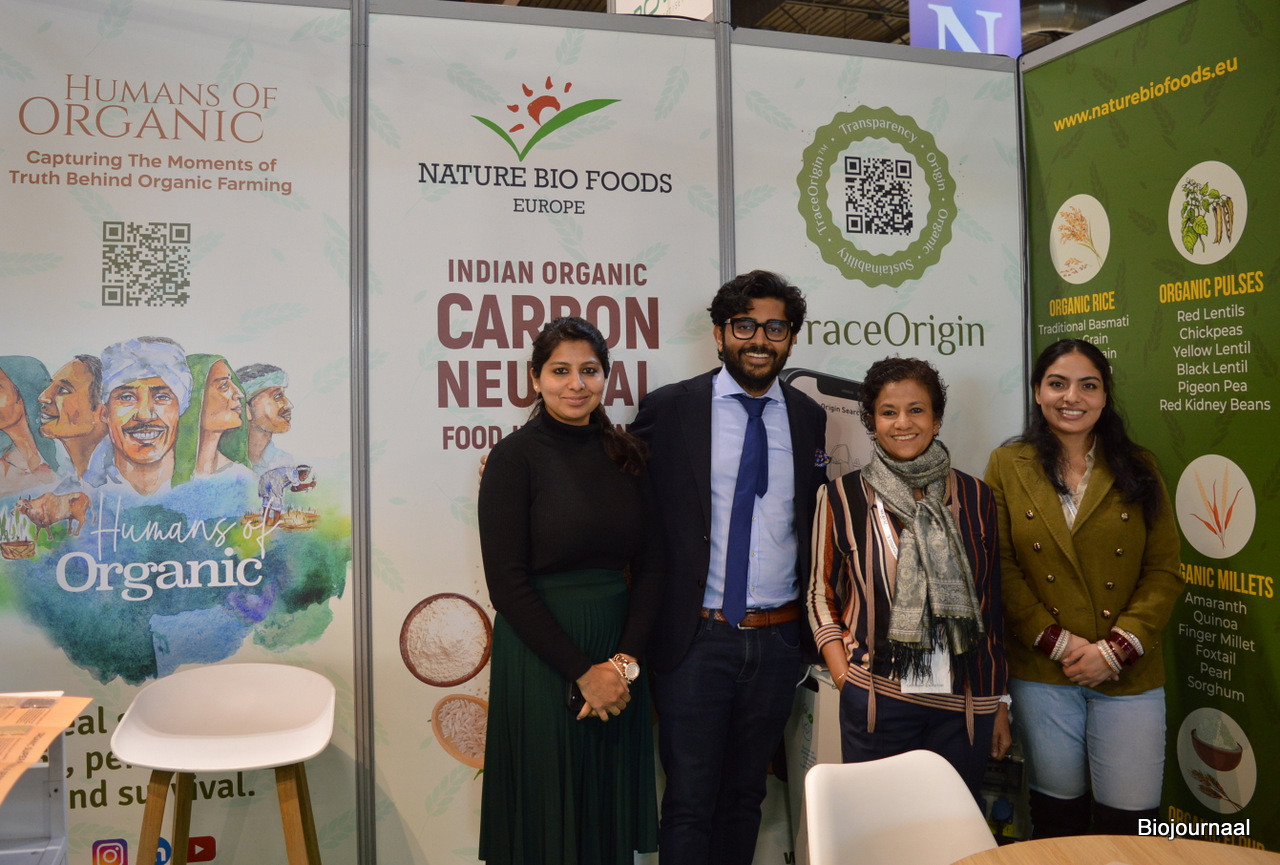 Bij Nature Bio Foods (vestiging in Rotterdam) lag de nadruk op het project Humans of Organic, de carbon neutral biologische rijst uit India en Trace origin, waarbij de hele block chain in beeld wordt gebracht door het 'lot number' van een product in de vullen. Op de foto: Rachita Ravishankar, Rohan Grover, Beena Paradin en Rashi Ghadha. "Er zijn inmiddels meer dan 800 mensen werkzaam bij ons. Wij brengen de ingrediënten tot aan de poort/producent", aldus Rohan.