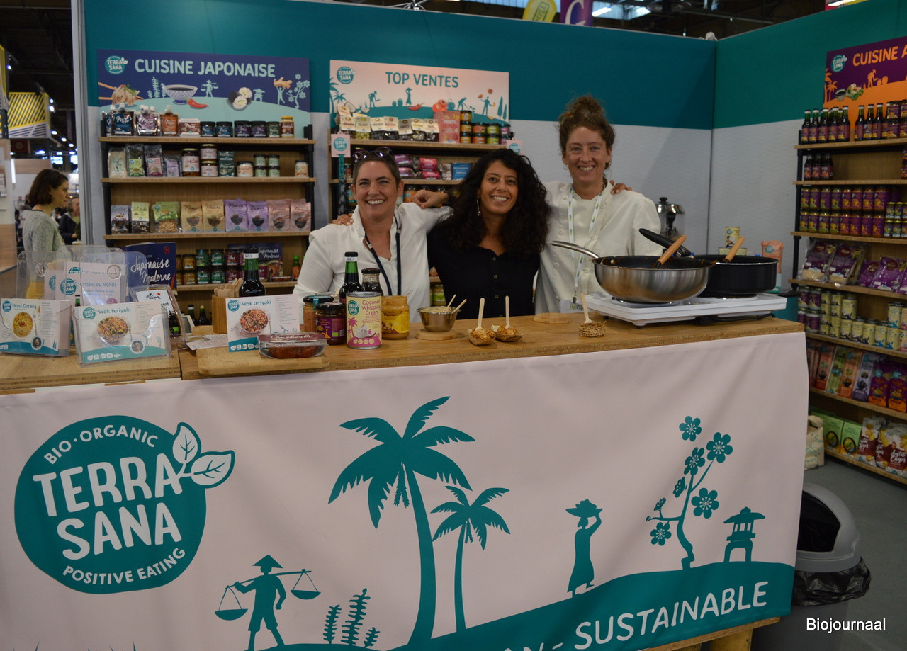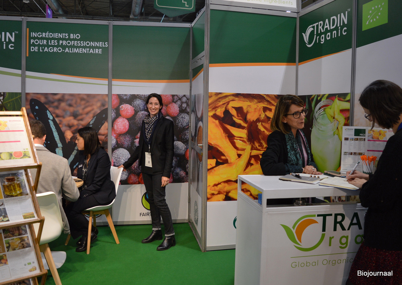 De nodige gesprekken zijn gaande bij Tradin Organic Agriculture. In het midden Cynthia Bali, die voor het eerst mee was. "Ik ben als INKOPER normaal wat meer op de achtergrond actief. Het is leuk dat ik hier wat gezichten achter de stemmen kan zien. Ik heb al veel klanten persoonlijk kunnen ontmoeten. Frankrijk is een goede markt voor ons", aldus Cynthia. Rechts