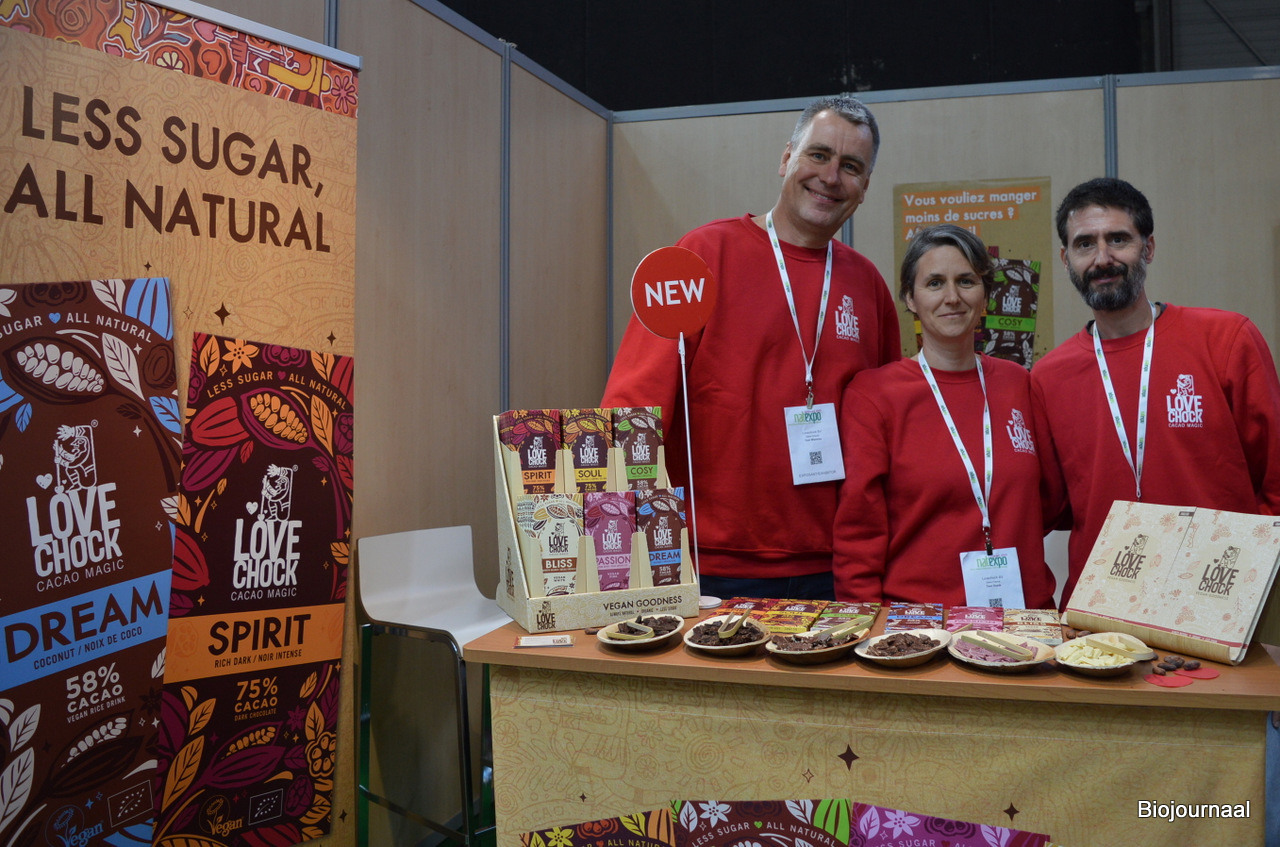 Bij Lovechock: Tom Wiersma, Twei Sturm en Rudolph Berthoux. Tom: "We zijn erg te spreken over het verloop van de beurs, we hebben al veel mensen gesproken die het merk nog niet kennen. Het publiek is ook vrij internationaal." Op de voorgrond de vegan range die voor de verandering eens niet gemaakt is op basis van rauwe chocolade.