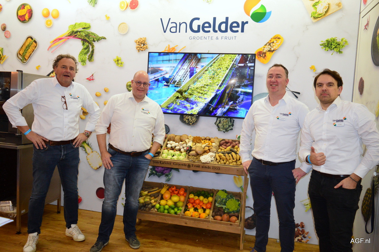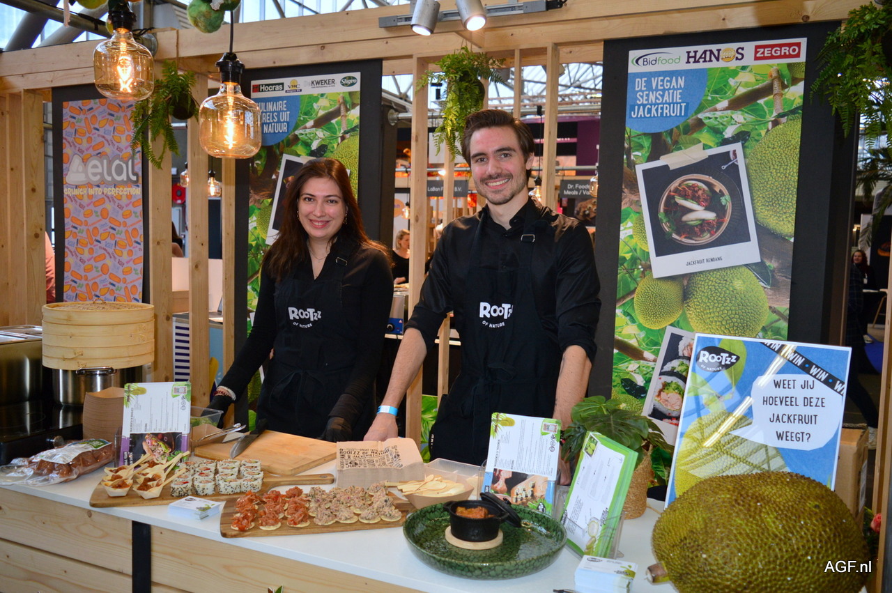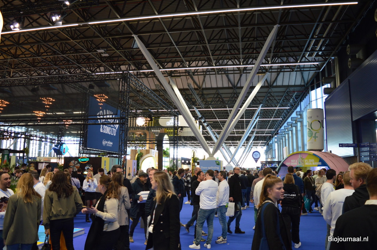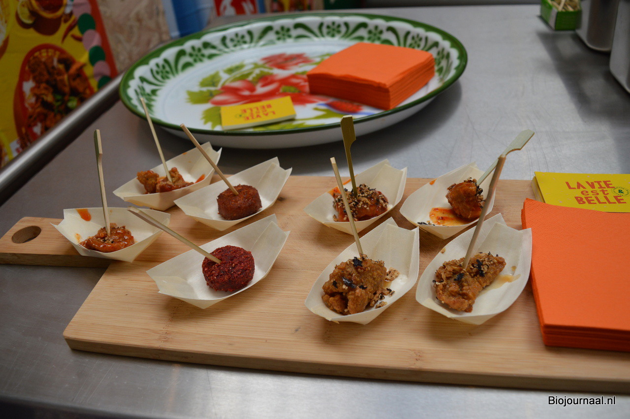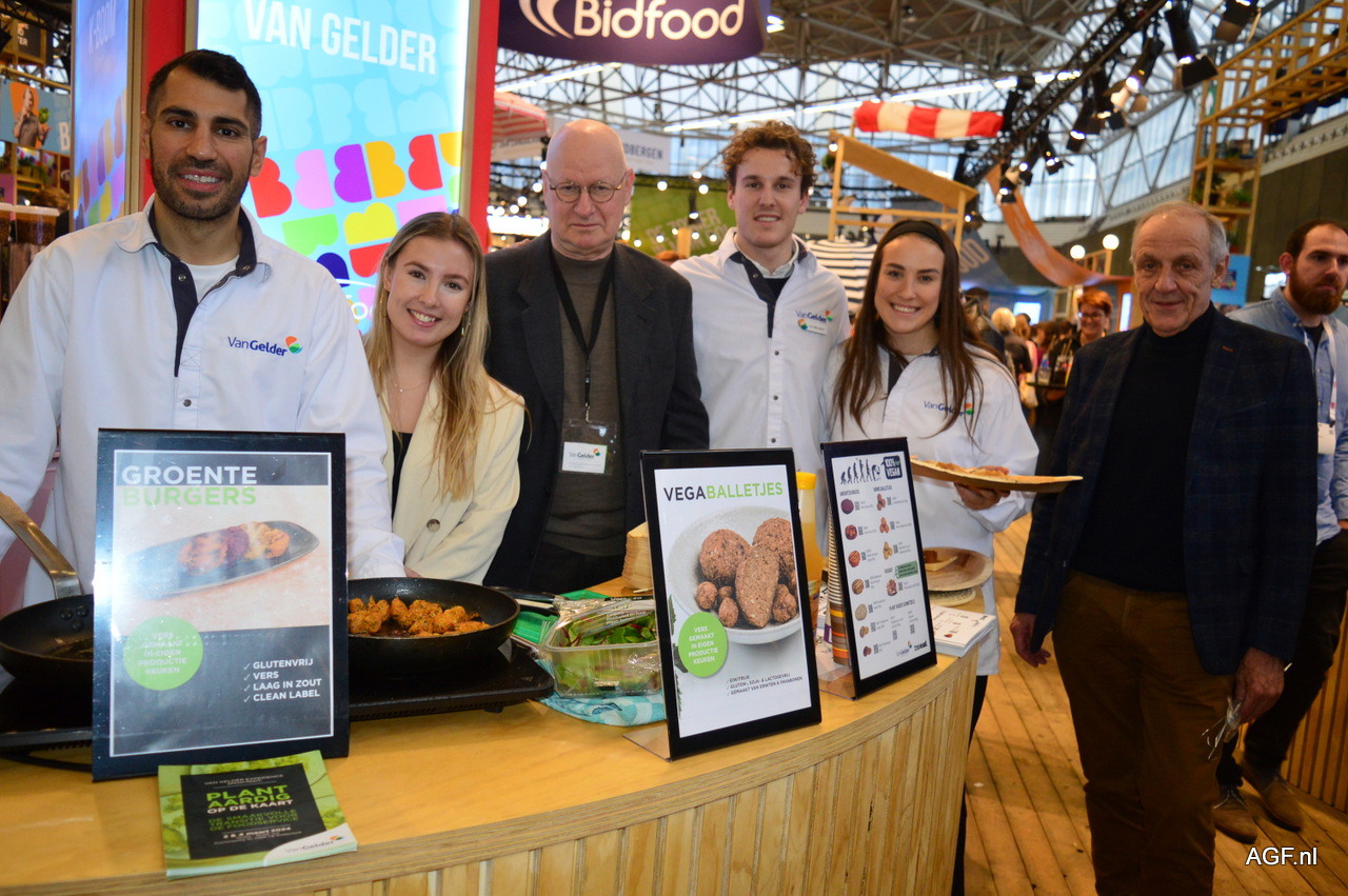 Op meerdere plekken was Van Gelder vertegenwoordigd op de beurs. Ook hier op het plein van Bidfood met groenteburgers en vegaballetjes.