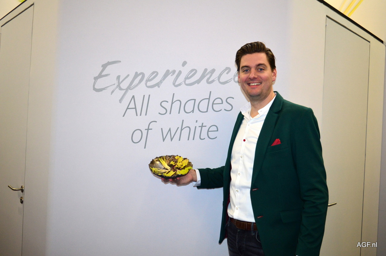 Stijn Baan van met de specialties van Koppert Cress. Hij staat voor de Experience room, hier kunnen de chef-koks zien hoe specialties in het donker geteeld worden.